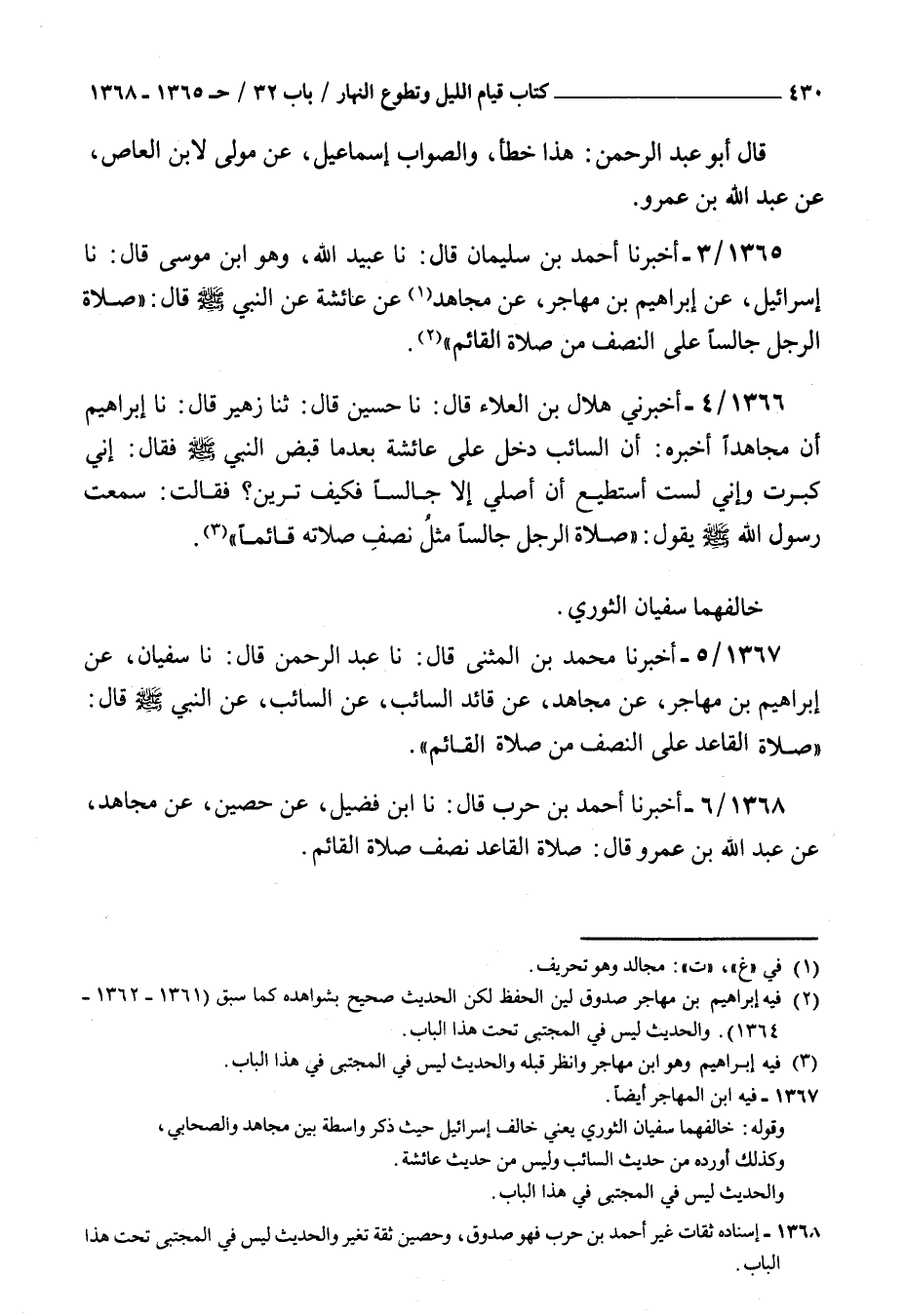 1368 - أخبرنا أحمد بن حرب قال نا بن فضيل عن حصين عن مجاهد عن عبد الله بن عمرو قال : صلاة القاعد نصف صلاة القائم
