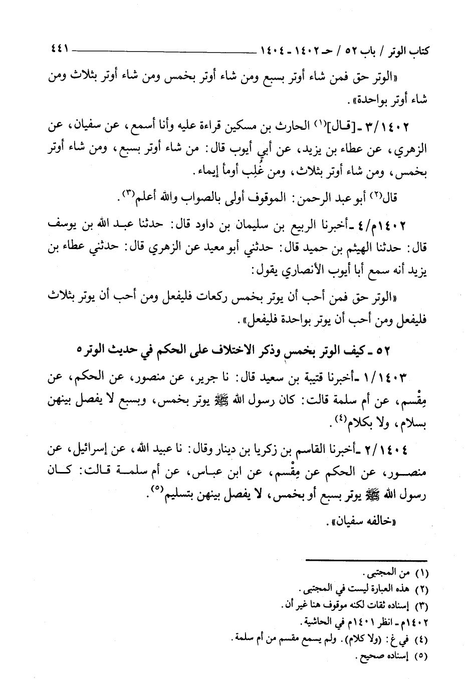 1404 - أخبرنا القاسم بن زكريا بن دينار وقال نا عبيد الله عن إسرائيل عن منصور عن الحكم عن مقسم عن بن عباس عن أم سلمة قالت : كان رسول الله صلى الله عليه و سلم يوتر بسبع أو بخمس لا يفصل بينهن بتسليم خالفه سفيان