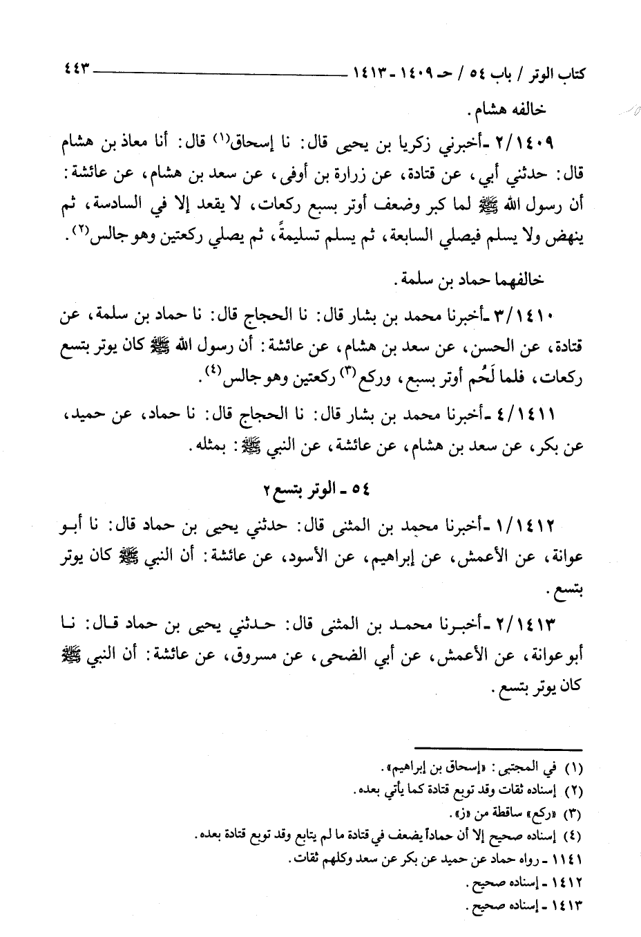 1412 - أخبرنا محمد بن المثنى قال حدثني يحيى بن حماد قال نا أبو عوانة عن الأعمش عن إبراهيم عن الأسود عن عائشة : أن النبي صلى الله عليه و سلم كان يوتر بتسع