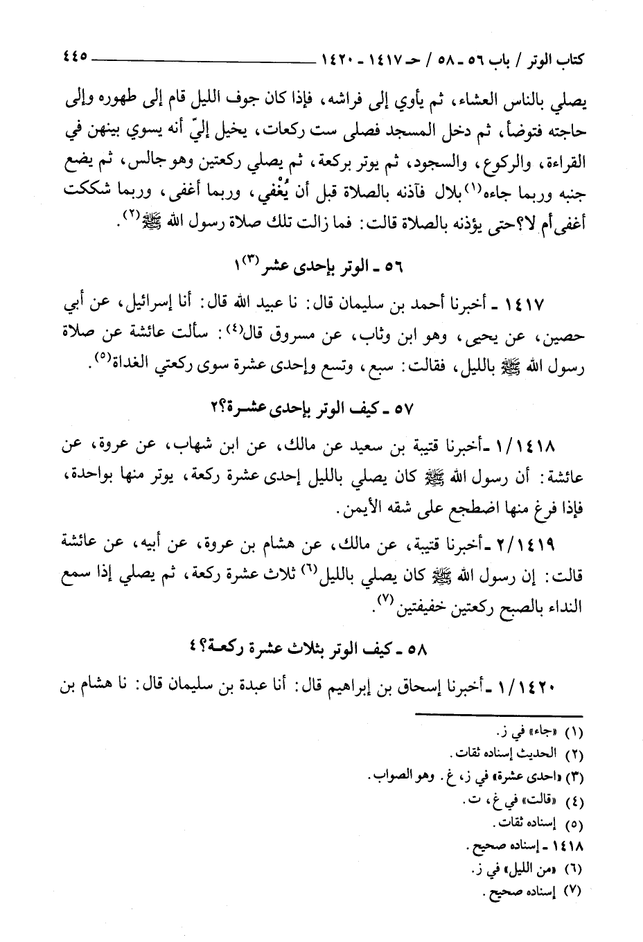 1417 - أخبرنا أحمد بن سليمان قال نا عبيد الله قال أنا إسرائيل عن أبي حصين عن يحيى وهو بن وثاب عن مسروق قال : سألت عائشة عن صلاة رسول الله صلى الله عليه و سلم بالليل فقالت سبع وتسع وإحدى عشرة سوى ركعتي الغداة