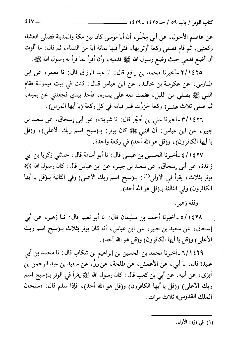 1428 - أخبرنا أحمد بن سليمان قال نا أبو نعيم قال نا زهير عن أبي إسحاق عن سعيد بن جبير عن بن عباس : أنه كان يوتر بثلاث ب سبح اسم ربك الأعلى وقل يا أيها الكافرون وقل هو الله أحد