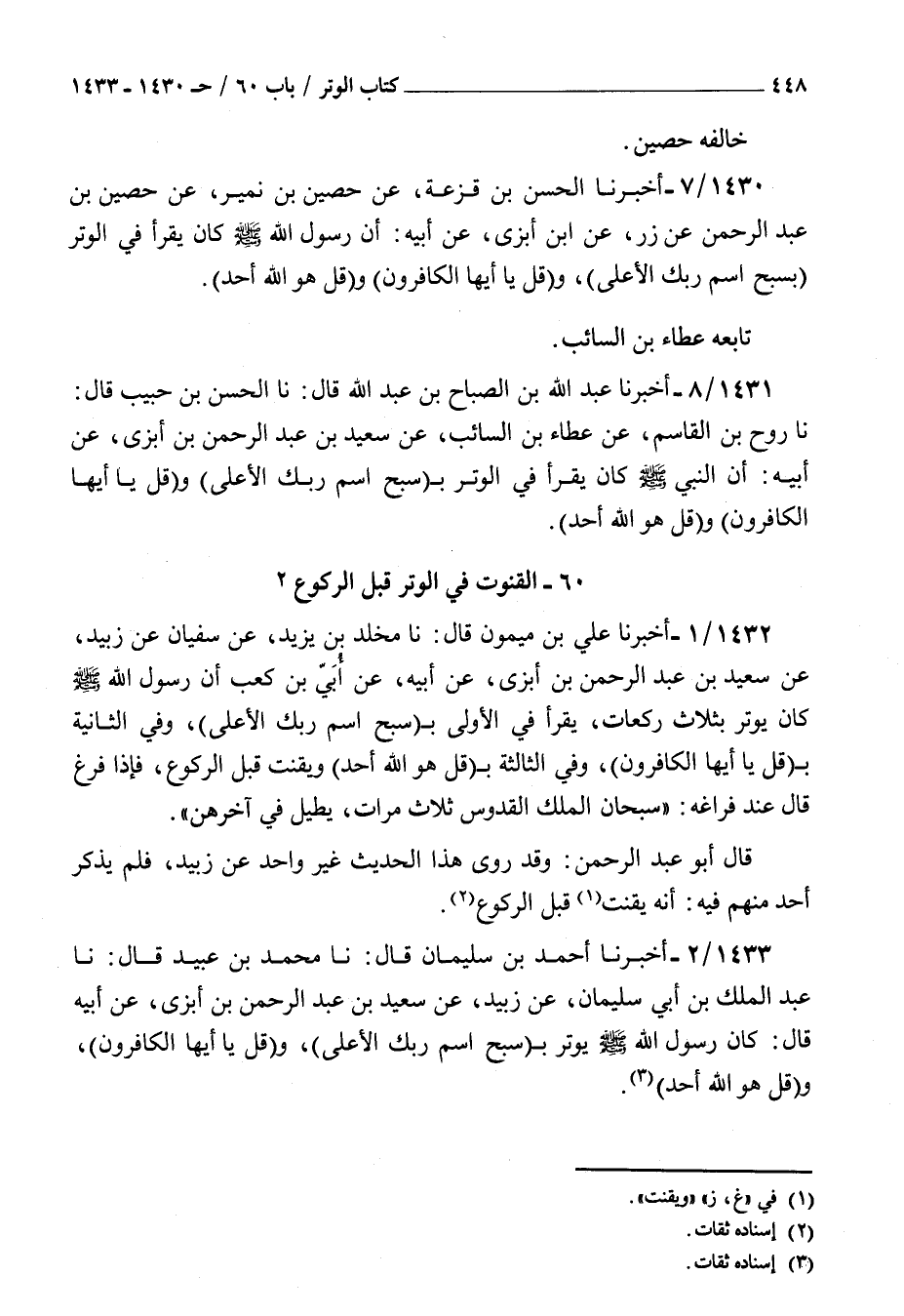 1432 - أخبرنا علي بن ميمون قال نا مخلد بن يزيد عن سفيان عن زبيد عن سعيد بن عبد الرحمن بن أبزى عن أبيه عن أبي بن كعب : أن رسول الله صلى الله عليه و سلم كان يوتر بثلاث ركعات يقرأ في الأولى ب سبح اسم ربك الأعلى وفي الثانية ب قل يا أيها الكافرون وفي الثالثة ب قل هو الله أحد ويقنت قبل الركوع فإذا فرغ قال عند فراغه سبحان الملك القدوس ثلاث مرات يطيل في آخرهن قال أبو عبد الرحمن وقد روى هذا الحديث غير واحد عن زبيد فلم يذكر أحد منهم فيه أن قنت قبل الركوع