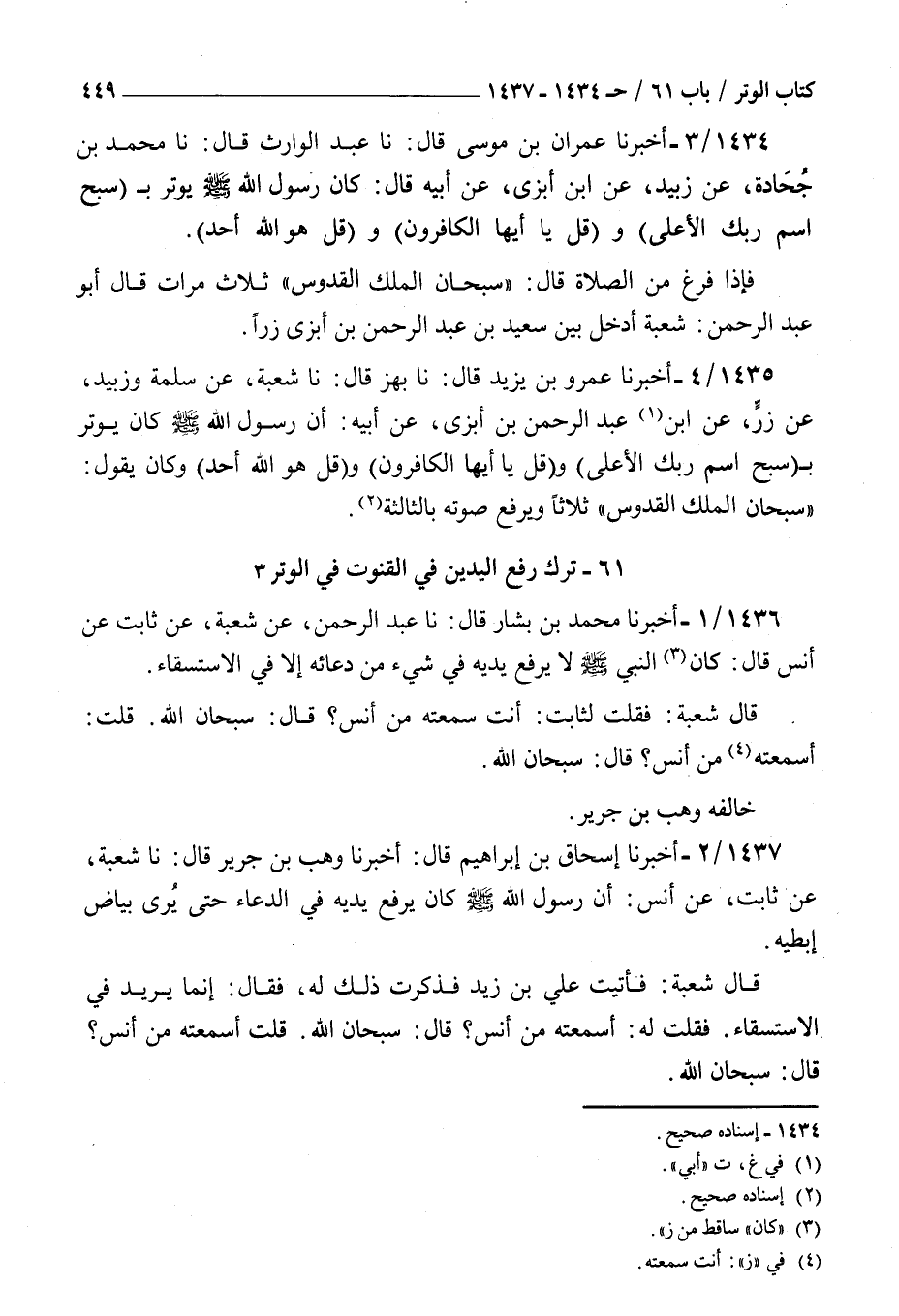 1434 - أخبرنا عمران بن موسى قال نا عبد الوارث قال نا محمد بن جحادة عن زبيد عن بن أبزى عن أبيه قال : كان رسول الله صلى الله عليه و سلم يوتر ب سبح اسم ربك الأعلى وقل يا أيها الكافرون وقل هو الله أحد فإذا فرغ من الصلاة قال سبحان الملك القدوس ثلاث مرات قال أبو عبد الرحمن شعبة أدخل بين سعيد بن عبد الرحمن بن أبزى زرا