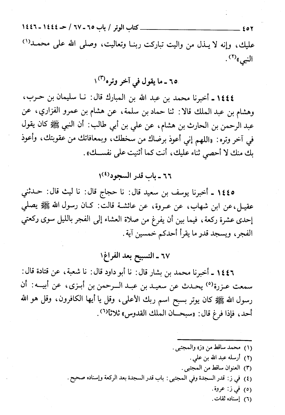 1444 - أخبرنا محمد بن عبد الله بن المبارك قال نا سليمان بن حرب وهشام بن عبد الملك قالا ثنا حماد بن سملة عن هشام بن عمرو الفزاري عن عبد الرحمن بن الحارث بن هشام عن علي بن أبي طالب : أن النبي صلى الله عليه و سلم كان يقول في آخر وتره اللهم إني أعوذ برضاك من سخطك وبمعافاتك من عقوبتك أعوذ بك منك لا أحصي ثناء عليك أنت كما أثنيت على نفسك