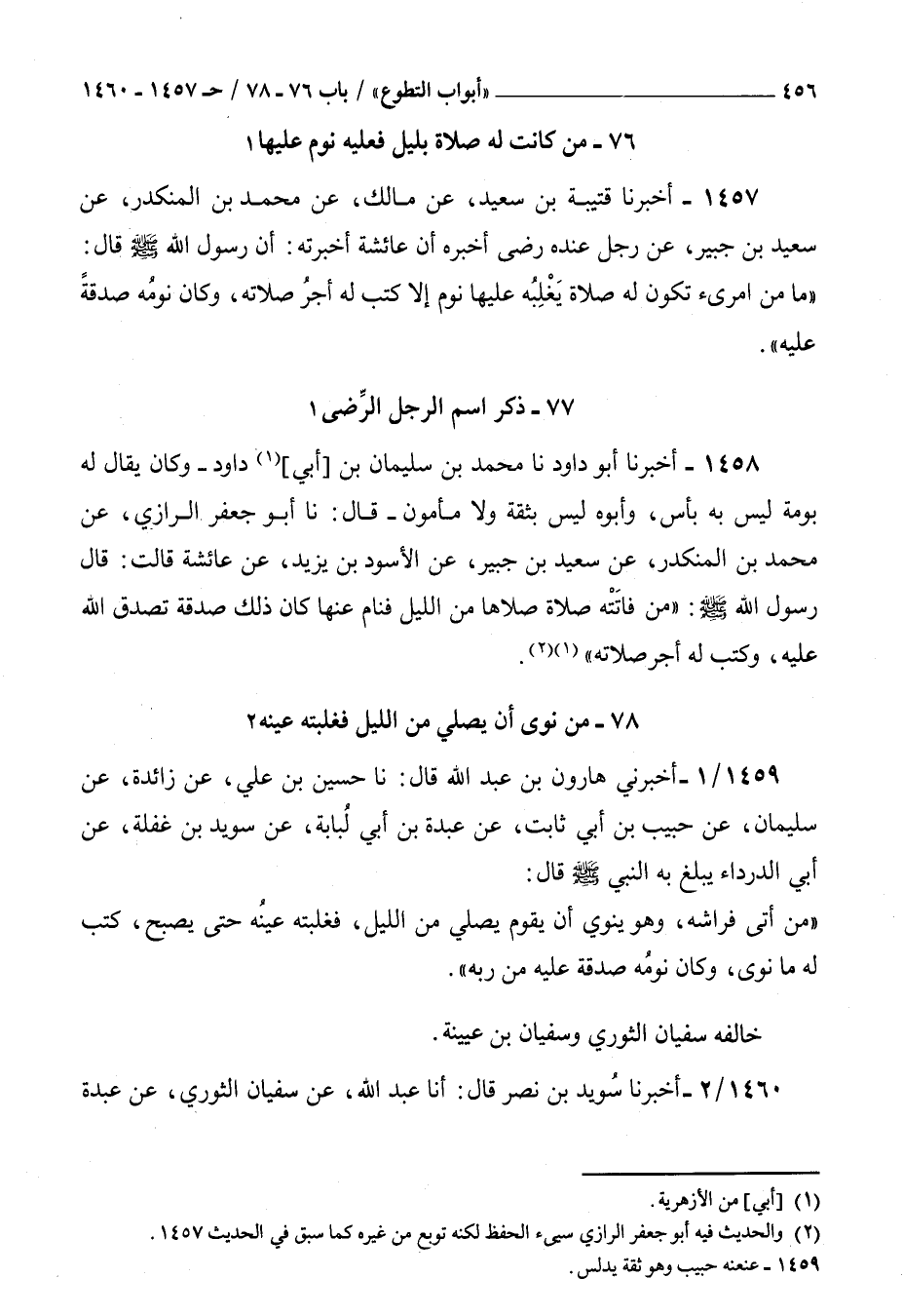 1459 - أخبرني هارون بن عبد الله قال نا حسين بن علي عن زائدة عن سليمان عن حبيب بن أبي ثابت عن عبدة بن أبي لبابة عن سويد بن غفلة عن أبي الدرداء يبلغ به النبي صلى الله عليه و سلم قال : من أتى فراشه وهو ينوي أن يقوم يصلي من الليل فغلبته عينه حتى يصبح كتب له ما نوى وكان نومه صدقة عليه من ربه خالفه سفيان الثوري وسفيان بن عيينة