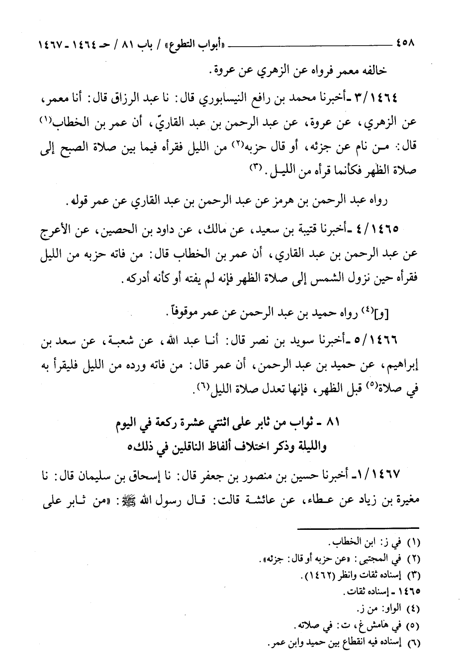 1464 - أخبرنا محمد بن رافع النيسابوري قال نا عبد الرزاق قال أنا معمر عن الزهري عن عروة عن عبد الرحمن بن عبد القارئ أن عمر بن الخطاب قال : من نام عن جزئه أو قال حزبه من الليل فقرأه فيما بين صلاة الصبح إلى صلاة الظهر فكأنما قرأه من الليل رواه عبد الرحمن بن هرمز عن عبد الرحمن بن عبد القارئ عن عمر قوله
