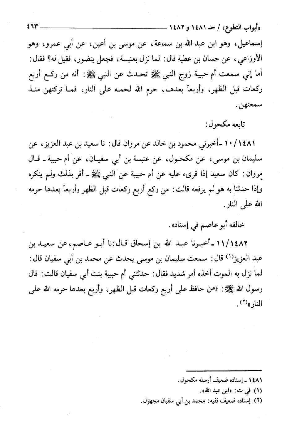 1481 - أخبرني محمود بن خالد عن مروان قال نا سعيد بن عبد العزيز عن سليمان بن موسى عن مكحول عن عنبسة بن أبي سفيان عن أم حبيبة قال مروان كان سعيد إذا قرئ عليه عن أم حبيبة عن النبي صلى الله عليه و سلم أقر بذلك ولم ينكره وإذا حدثنا به هو لم يرفعه قالت : من ركع أربع ركعات قبل الظهر وأربعا بعدها حرمه الله على النار خالفه أبو عاصم في إسناده