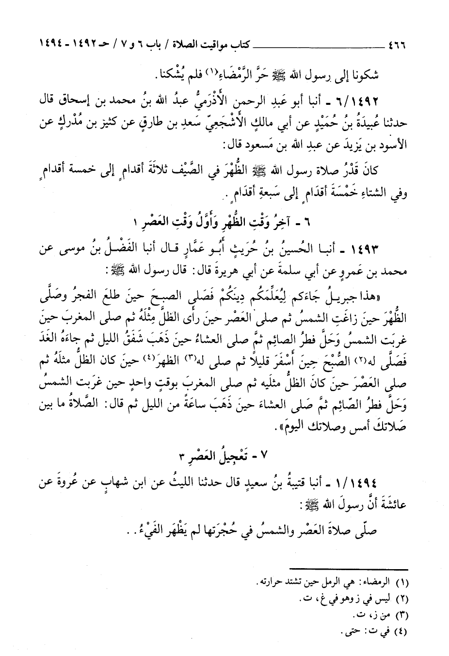 1492 - أنبأ أبو عبد الرحمن الأذرمي عبد الله بن محمد بن إسحاق قال حدثنا عبيدة بن حميد عن أبي مالك الأشجعي سعد بن طارق عن كثير بن مدرك عن الأسود بن يزيد عن عبد الله بن مسعود قال : كان قدر صلاة رسول الله صلى الله عليه و سلم الظهر في الصيف ثلاثة أقدام إلى خمسة أقدام وفي الشتاء خمسة أقدام إلى سبعة أقدام