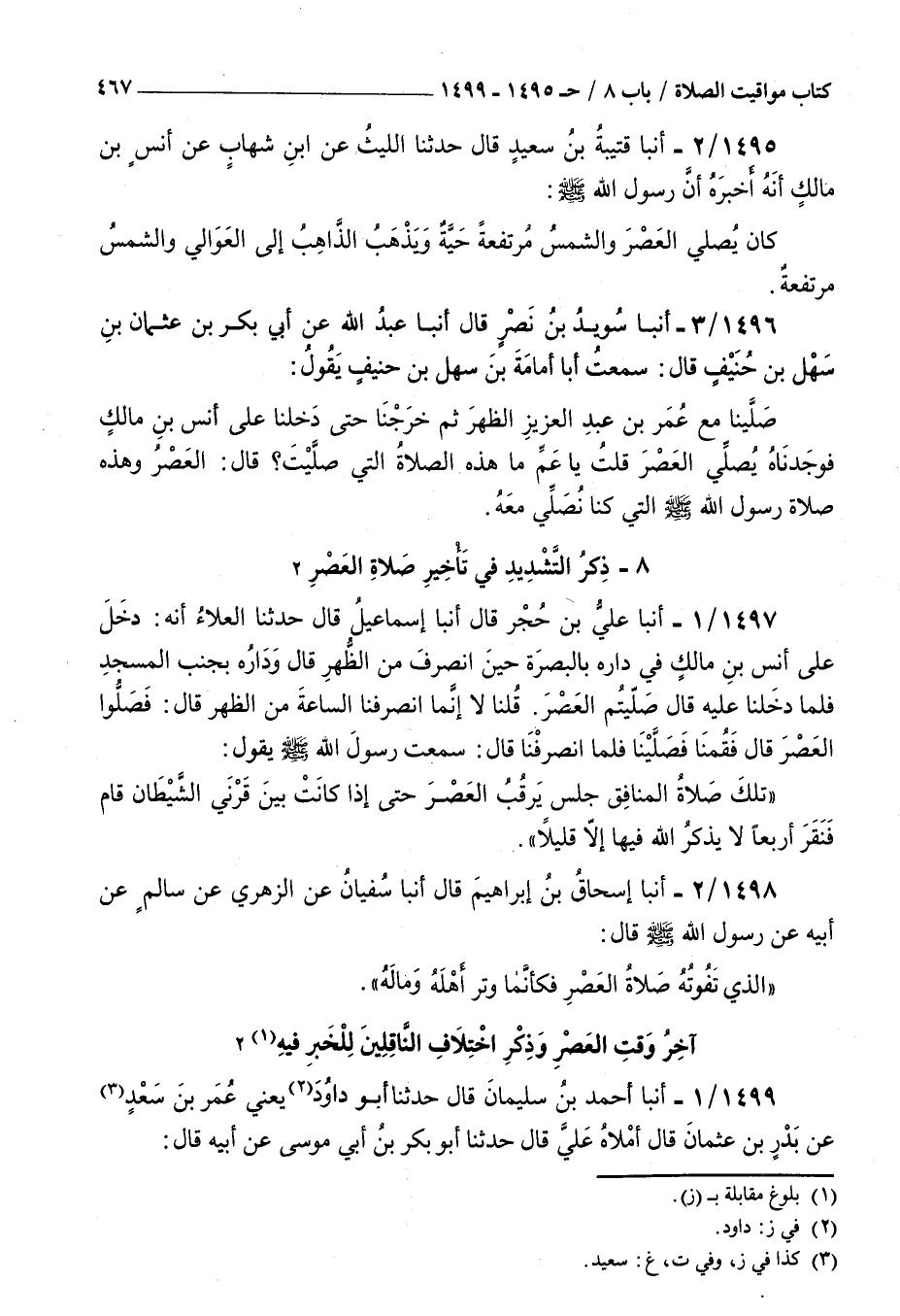 1498 - أنبأ إسحاق بن إبراهيم قال أنبأ سفيان عن الزهري عن سالم عن أبيه عن رسول الله صلى الله عليه و سلم قال : الذي تفوته صلاة العصر فكأنما وتر أهله وماله آخر وقت العصر وذكر اختلاف الناقلين للخبر فيه