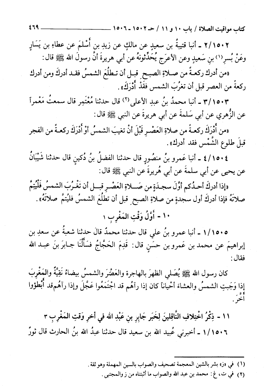 1504 - أنبأ عمرو بن منصور قال حدثنا الفضل بن دكين قال حدثنا شيبان عن يحيى عن أبي سلمة عن أبي هريرة عن النبي صلى الله عليه و سلم قال : إذا أدرك أحدكم أول سجدة من صلاة العصر قبل أن تغرب الشمس فليتم صلاته فإذا أدرك أول سجدة من صلاة الصبح قبل أن تطلع الشمس فليتم صلاته