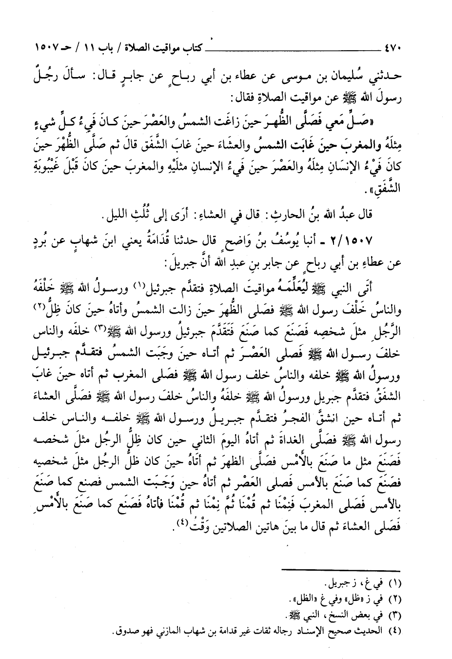 1507 - أنبأ يوسف بن واضح قال حدثنا قدامة يعني بن شهاب عن برد عن عطاء بن أبي رباح عن جابر بن عبد الله : أن جبريل أتى النبي صلى الله عليه و سلم ليعلمه مواقيت الصلاة فتقدم جبريل ورسول الله صلى الله عليه و سلم خلفه والناس خلف رسول الله صلى الله عليه و سلم فصلى الظهر حين زالت الشمس وأتاه حين كان ظل الرجل مثل شخصه فصنع كما صنع فتقدم جبرائيل ورسول الله صلى الله عليه و سلم خلفه والناس خلف رسول الله صلى الله عليه و سلم فصلى العصر ثم أتاه حين وجبت الشمس فتقدم جبرائيل ورسول الله صلى الله عليه و سلم خلفه والناس خلف رسول الله صلى الله عليه و سلم فصلى المغرب ثم أتاه حين غاب الشفق فتقدم جبريل ورسول الله صلى الله عليه و سلم خلفه والناس خلف رسول الله صلى الله عليه و سلم فصلى العشاء ثم أتاه حين انشق الفجر فتقدم جبريل ورسول الله صلى الله عليه و سلم خلفه والناس خلف رسول الله صلى الله عليه و سلم فصلى الغداة ثم أتاه اليوم الثاني حين كان ظل الرجل مثل شخصه فصنع مثل ما صنع بالأمس فصلى الظهر ثم أتاه حين كان ظل الرجل مثل شخصيه فصنع كما صنع بالأمس فصلى العصر ثم أتاه حين وجبت الشمس فصنع كما صنع بالأمس فصلى المغرب فنمنا ثم قمنا ثم نمنا ثم قمنا فأتاه فصنع كما صنع بالأمس فصلى العشاء ثم قال ما بين هاتين الصلاتين وقت