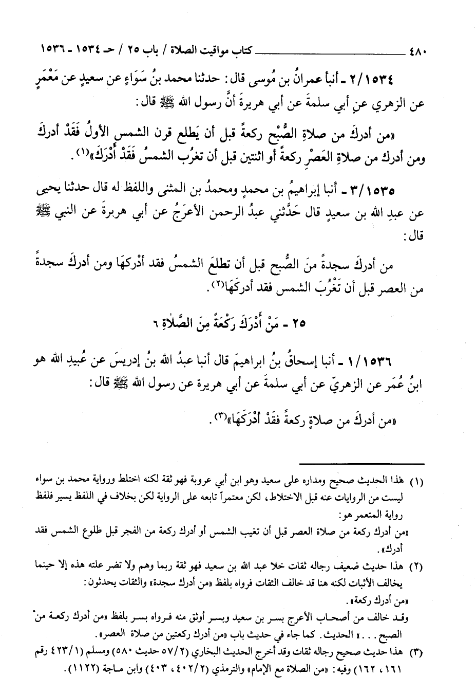 1535 - أنبأ إبراهيم بن محمد ومحمد بن المثنى واللفظ له قال حدثنا يحيى عن عبد الله بن سعيد قال حدثني عبد الرحمن الأعرج عن أبي هريرة عن النبي صلى الله عليه و سلم قال : من أدرك سجدة من الصبح قبل أن تطلع الشمس فقد أدركها ومن أدرك سجدة من العصر قبل أن تغرب الشمس فقد أدركها
