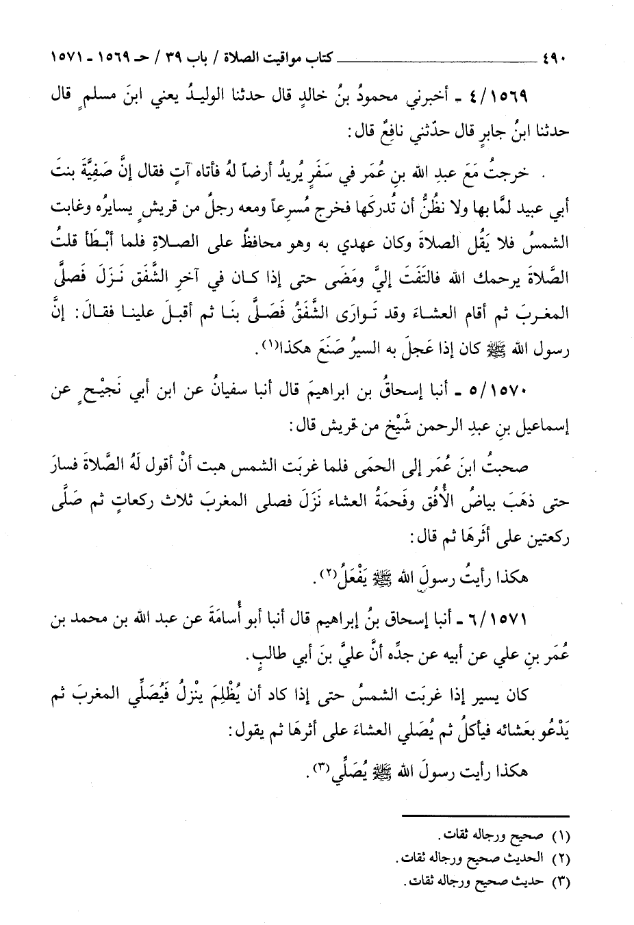 1569 - أخبرني محمود بن خالد قال حدثنا الوليد يعني بن مسلم قال حدثنا بن جابر قال حدثني نافع قال : خرجت مع عبد الله بن عمر في سفر يريد أرضا له فأتاه آت فقال إن صفية بنت أبي عبيد لما بها ولا نظن أن تدركها فخرج مسرعا ومعه رجل من قريش يسايره وغابت الشمس فلا يقل الصلاة وكان عهدي به وهو محافظ على الصلاة فلما أبطأ قلت الصلاة يرحمك الله فالتفت إلي ومضى حتى إذا كان في آخر الشفق نزل فصلى المغرب ثم أقام العشاء وقد توارى الشفق فصلى بنا ثم أقبل علينا فقال إن رسول الله صلى الله عليه و سلم كان إذا عجل به السير صنع هكذا