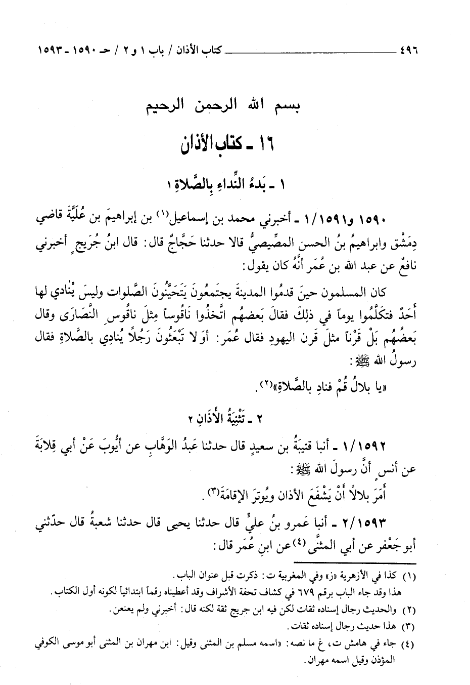 1590 - أخبرني محمد بن إسماعيل بن إبراهيم بن علية قاضي دمشق وإبراهيم بن الحسن المصيصي قالا حدثنا حجاج قال قال بن جريج أخبرني نافع عبد الله بن عمر أنه كان يقول : كان المسلمون حين قدموا المدينة يجتمعون يتحينون الصلوات وليس ينادي لها أحد فتكلموا يوما في ذلك فقال بعضهم اتخذوا ناقوسا مثل ناقوس النصارى وقال بعضهم بل قرنا مثل قرن اليهود فقال عمر أولا تبعثون رجلا ينادي بالصلاة فقال رسول الله صلى الله عليه و سلم يا بلال قم فناد بالصلاة