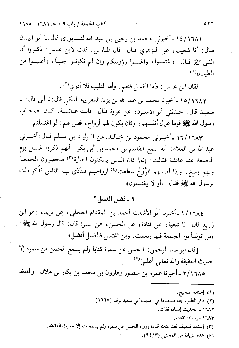1681 - أخبرني محمد بن يحيى بن عبد الله النيسابوري قال نا أبو اليمان قال أنا شعيب عن الزهري قال قال طاوس : قلت لابن عباس ذكروا أن النبي صلى الله عليه و سلم قال اغتسلوا واغسلوا رؤوسكم وإن لم تكونوا جنبا واصيبوا من الطيب فقال بن عباس فأما الغسل فنعم وأما الطيب فلا أدري