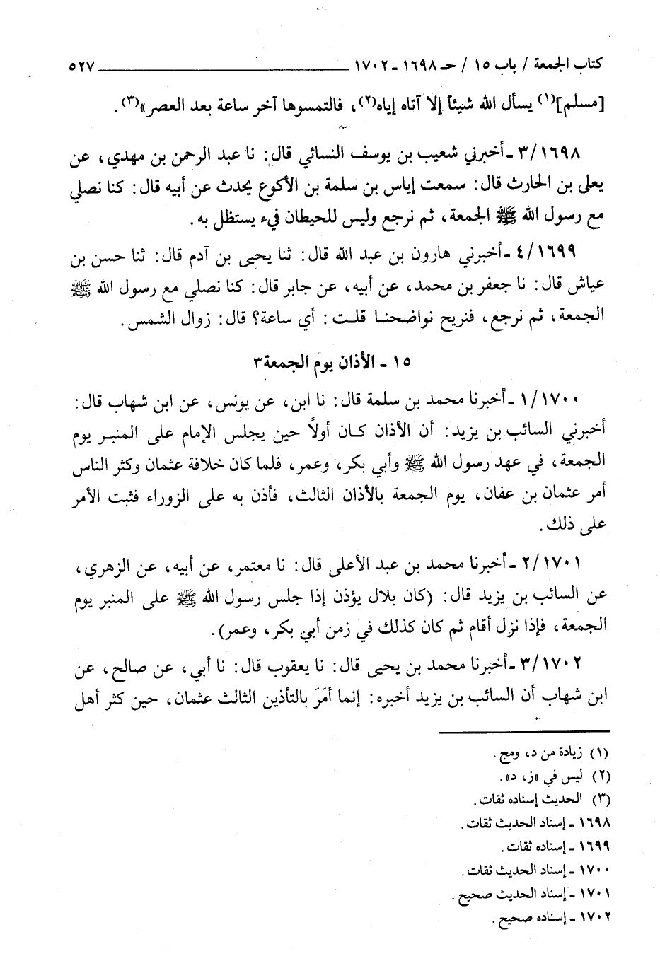 1700 - أخبرنا محمد بن سلمة قال نا بن عن يونس عن بن شهاب قال أخبرني السائب بن يزيد : أن الأذان كان أولا حين يجلس الإمام على المنبر يوم الجمعة في عهد رسول الله صلى الله عليه و سلم وأبي بكر وعمر فلما كان خلافة عثمان وكثر الناس أمر عثمان بن عفان يوم الجمعة بالأذان الثالث فأذن به على الزوراء فثبت الأمر على ذلك