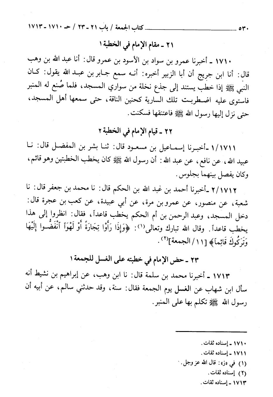 1713 - أخبرنا محمد بن سلمة قال نا بن وهب عن إبراهيم بن نشيط أنه سأل بن شهاب عن الغسل يوم الجمعة فقال سنة وقد حدثني سالم عن أبيه : أن رسول الله صلى الله عليه و سلم تكلم بها على المنبر