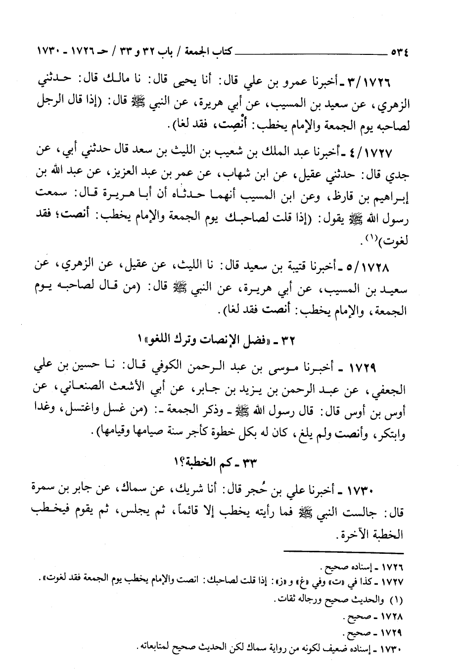 1726 - أخبرنا عمرو بن علي قال أنا يحيى قال نا مالك قال حدثني الزهري عن سعيد بن المسيب عن أبي هريرة عن النبي صلى الله عليه و سلم قال : إذا قال الرجل لصاحبه يوم الجمعة والإمام يخطب أنصت فقد لغا