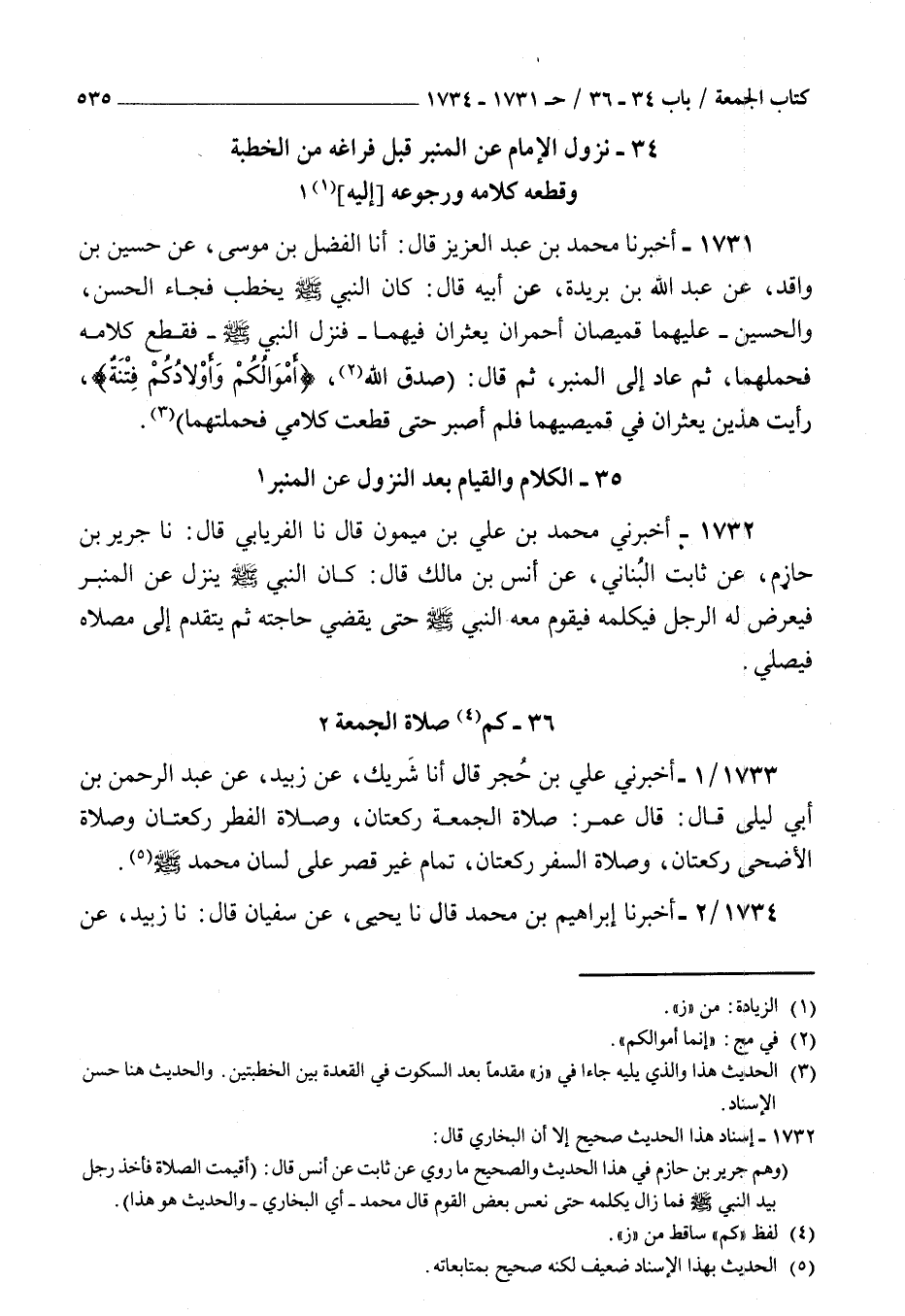 ( 34 نزول الإمام عن المنبر قبل فراغه من الخطبة وقطعه كلامه ورجوعه إليه )