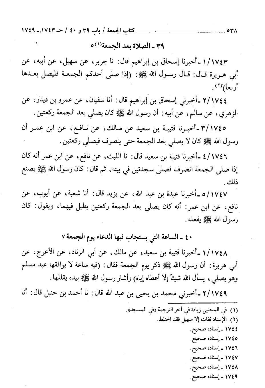 1743 - أخبرنا إسحاق بن إبراهيم قال نا جرير عن سهيل عن أبيه عن أبي هريرة قال قال رسول الله صلى الله عليه و سلم : إذا صلى أحدكم الجمعة فليصل بعدها أربعا