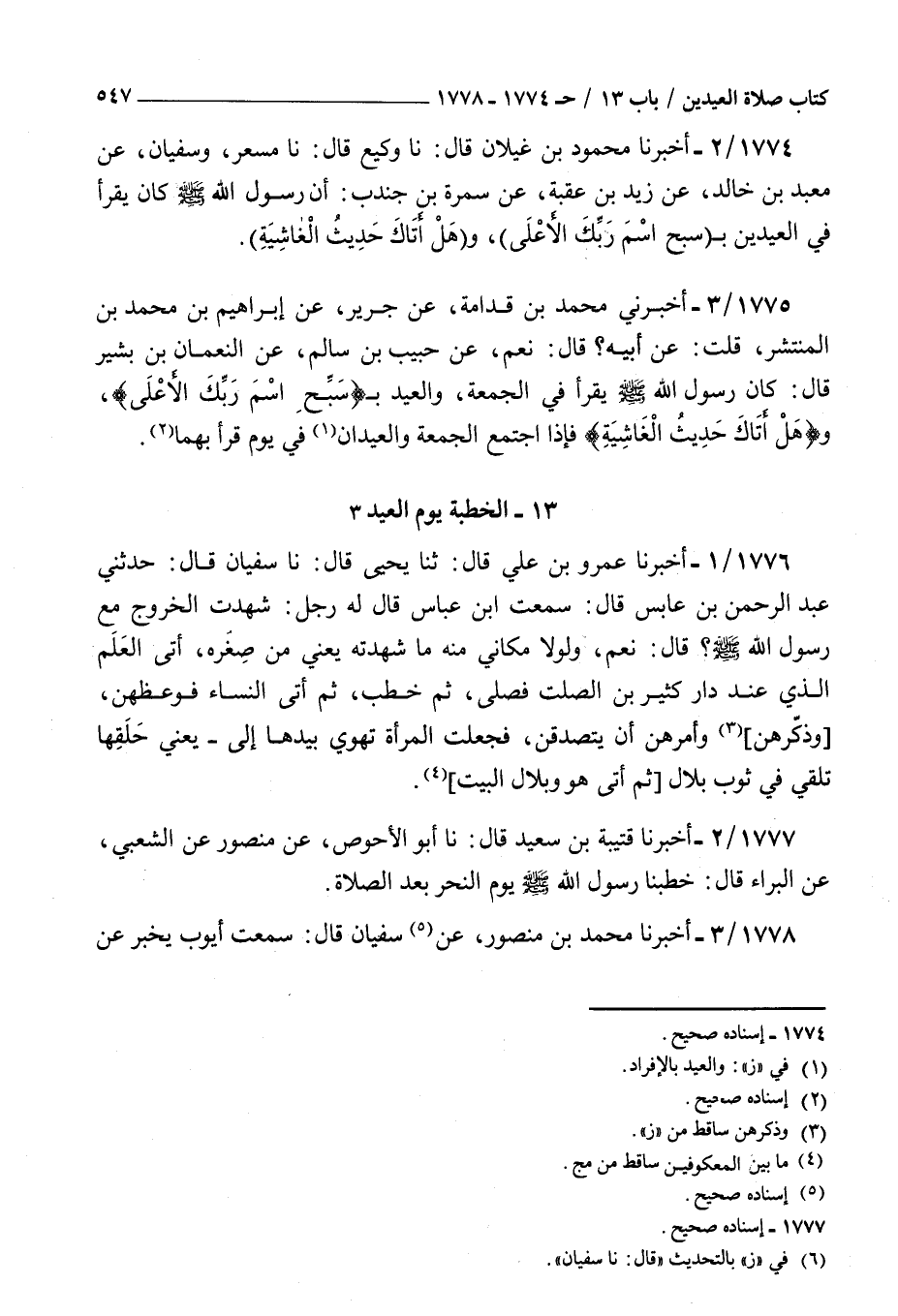 1774 - أخبرنا محمود بن غيلان قال نا وكيع قال نا مسعر وسفيان عن معبد بن خالد عن زيد بن عقبة عن سمرة بن جندب : أن رسول الله صلى الله عليه و سلم كان يقرأ في العيدين ب سبح اسم ربك الأعلى وهل أتاك حديث الغاشية