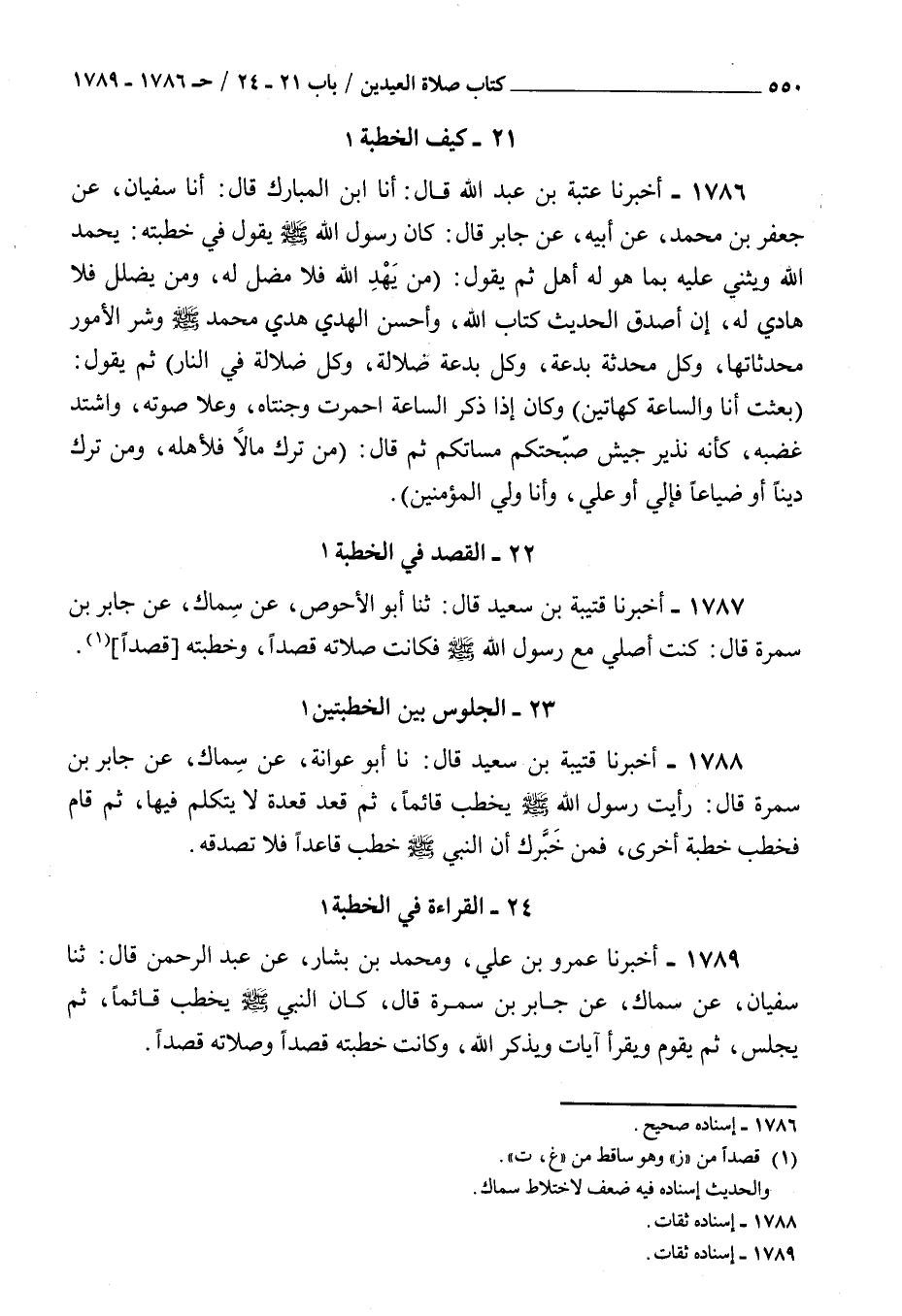 1787 - أخبرنا قتيبة بن سعيد قال ثنا أبو الأحوص عن سماك عن جابر بن سمرة قال : كنت أصلي مع رسول الله صلى الله عليه و سلم فكانت صلاته قصدا وخطبته قصدا