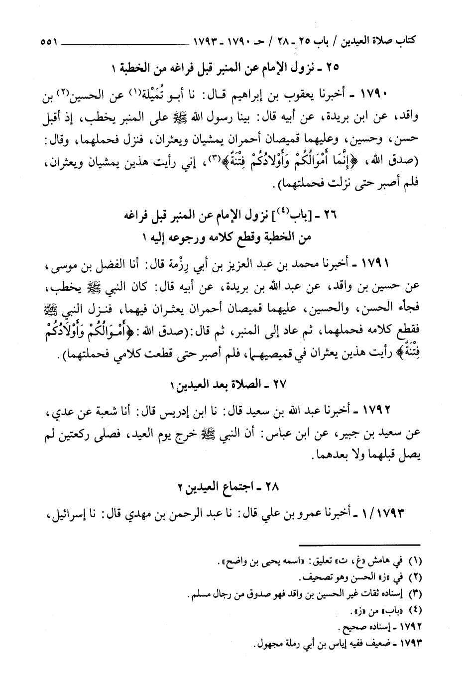 1790 - أخبرنا يعقوب بن إبراهيم قال نا أبو تميلة عن الحسين بن واقد عن بن بريدة عن أبيه قال : بينا رسول الله صلى الله عليه و سلم على المنبر يخطب إذ أقبل حسن وحسين وعليهما قميصان أحمران يمشيان ويعثران فنزل فحملهما وقال صدق الله إنما أموالكم وأولادكم فتنة إني رأيت هذين يمشيان ويعثران فلم أصبر حتى نزلت فحملتهما