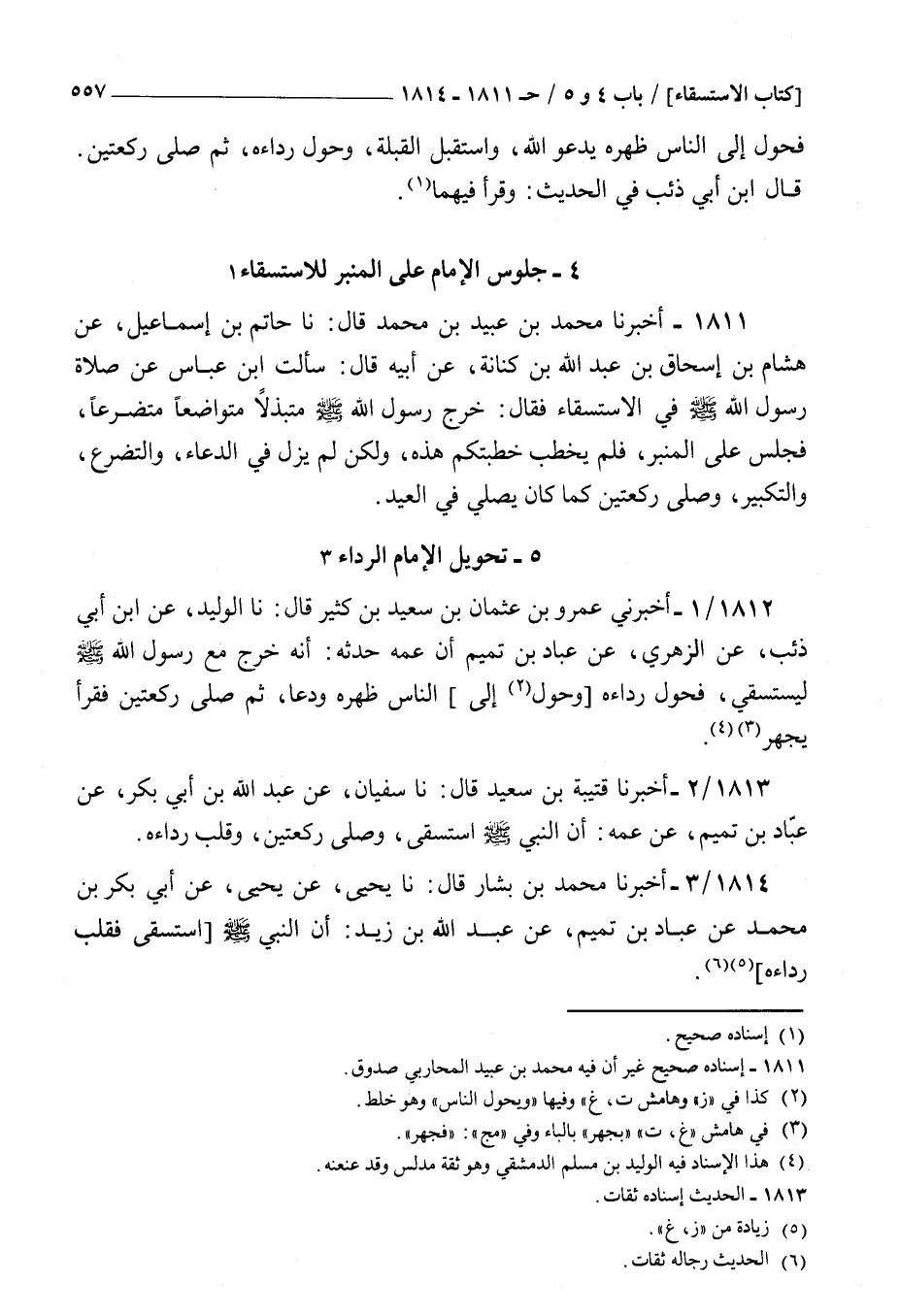 1812 - أخبرني عمرو بن عثمان بن سعيد بن كثير قال نا الوليد عن بن أبي ذئب عن الزهري عن عابد بن تميم أن عمه حدثه أنه : خرج مع رسول الله صلى الله عليه و سلم ليستسقي فحول رداءه وحول إلى الناس ظهره ودعا ثم صلى ركعتين فقرأ يجهر