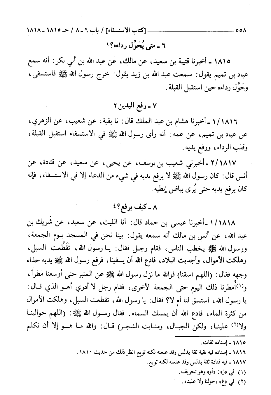 1816 - أخبرنا هشام بن عبد الملك قال نا بقية عن شعيب عن الزهري عن عباد بن تميم عن عمه : أنه رأى رسول الله صلى الله عليه و سلم في الاستسقاء استقبل القبلة وقلب الرداء ورفع يديه