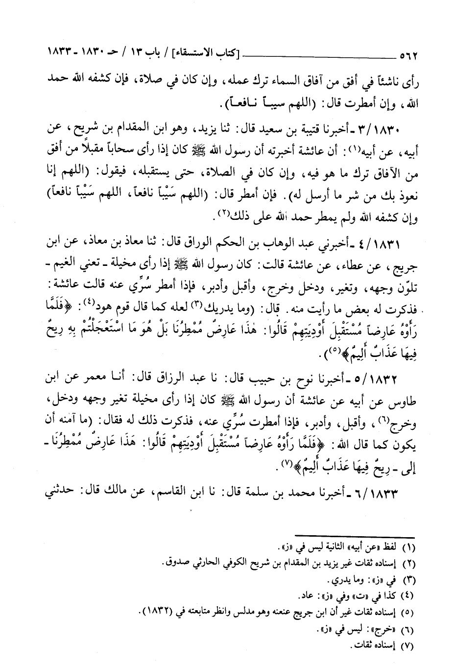 1830 - أخبرنا قتيبة بن سعيد قال ثنا يزيد وهو بن المقدام بن شريح عن أبيه عن أبيه أن عائشة أخبرته : أن رسول الله صلى الله عليه و سلم كان إذا رأى سحابا مقبلا من أفق من الآفاق ترك ما هو فيه وإن كان في الصلاة حتى يستقبله فيقول اللهم إنا نعوذ بك من شر ما أرسل له فإن أمطر قال اللهم سيبا نافعا اللهم سيبا نافعا وإن كشفه الله ولم يمطر حمد الله على ذلك
