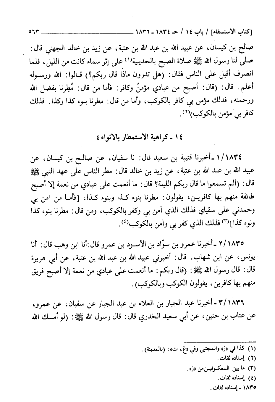 1834 - أخبرنا قتيبة بن سعيد قال نا سفيان عن صالح بن كيسان عن عبيد الله بن عبد الله بن عتبة عن زيد بن خالد قال مطر الناس على عهد النبي صلى الله عليه و سلم قال : ألم تسمعوا ما قال ربكم الليلة قال ما أنعمت على عبادي من نعمة إلا أصبح طائفة منهم بها كافرين يقولون مطرنا بنوء كذا وبنوء كذا فأما من آمن بي وحمدني على سقياي فذلك الذي آمن بي وكفر بالكوكب ومن قال مطرنا بنوء كذا ونوء كذا فذلك الذي كفر بي وآمن بالكوكب