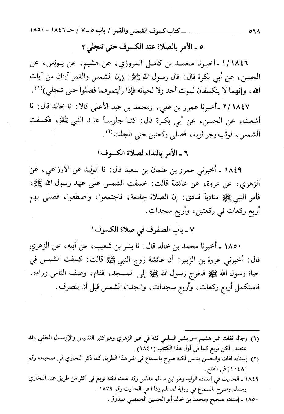 1847 - أخبرنا عمرو بن علي ومحمد بن عبد الأعلى قالا نا خالد قال نا أشعث عن الحسن عن أبي بكرة قال : كنا جلوسا عند النبي صلى الله عليه و سلم فكسفت الشمس فوثب يجر ثوبه فصلى ركعتين حتى انجلت