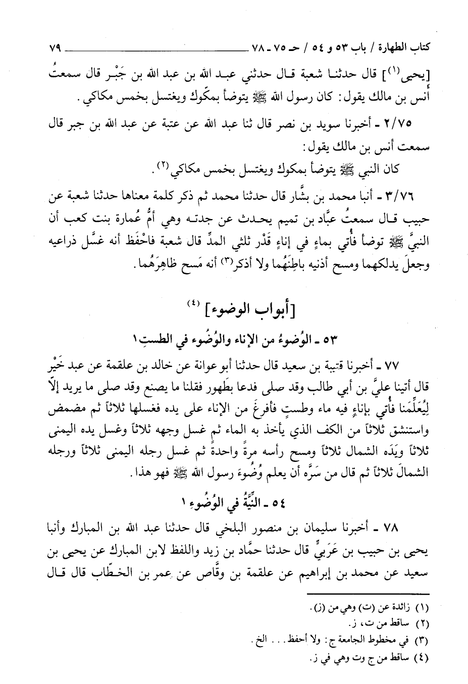 75 - أخبرنا سويد بن نصر قال ثنا عبد الله عن عتبة عن عبد الله بن جبر قال سمعت أنس بن مالك يقول : كان النبي صلى الله عليه و سلم يتوضأ بمكوك ويغتسل بخمس مكاكي