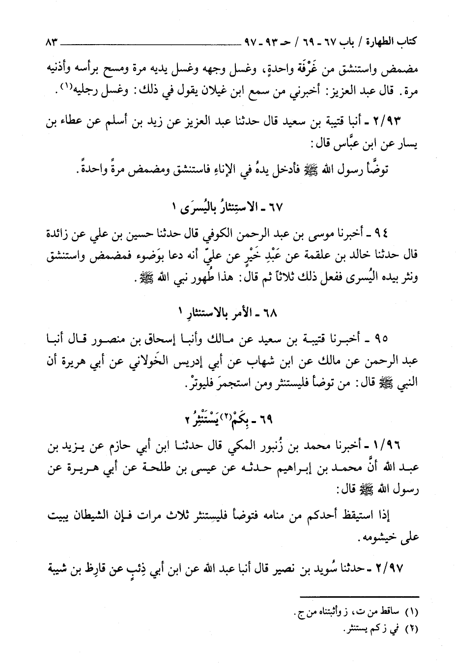 97 - حدثنا سويد بن نصير قال أنبأ عبد الله عن بن أبي ذئب عن قارظ بن شيبة عن أبي غطفان قال دخلت على بن عباس فوجدته يتوضأ فمضمض واستنثر ثم قال قال رسول الله صلى الله عليه و سلم : استنثروا اثنتين بالغتين أو ثلاثا