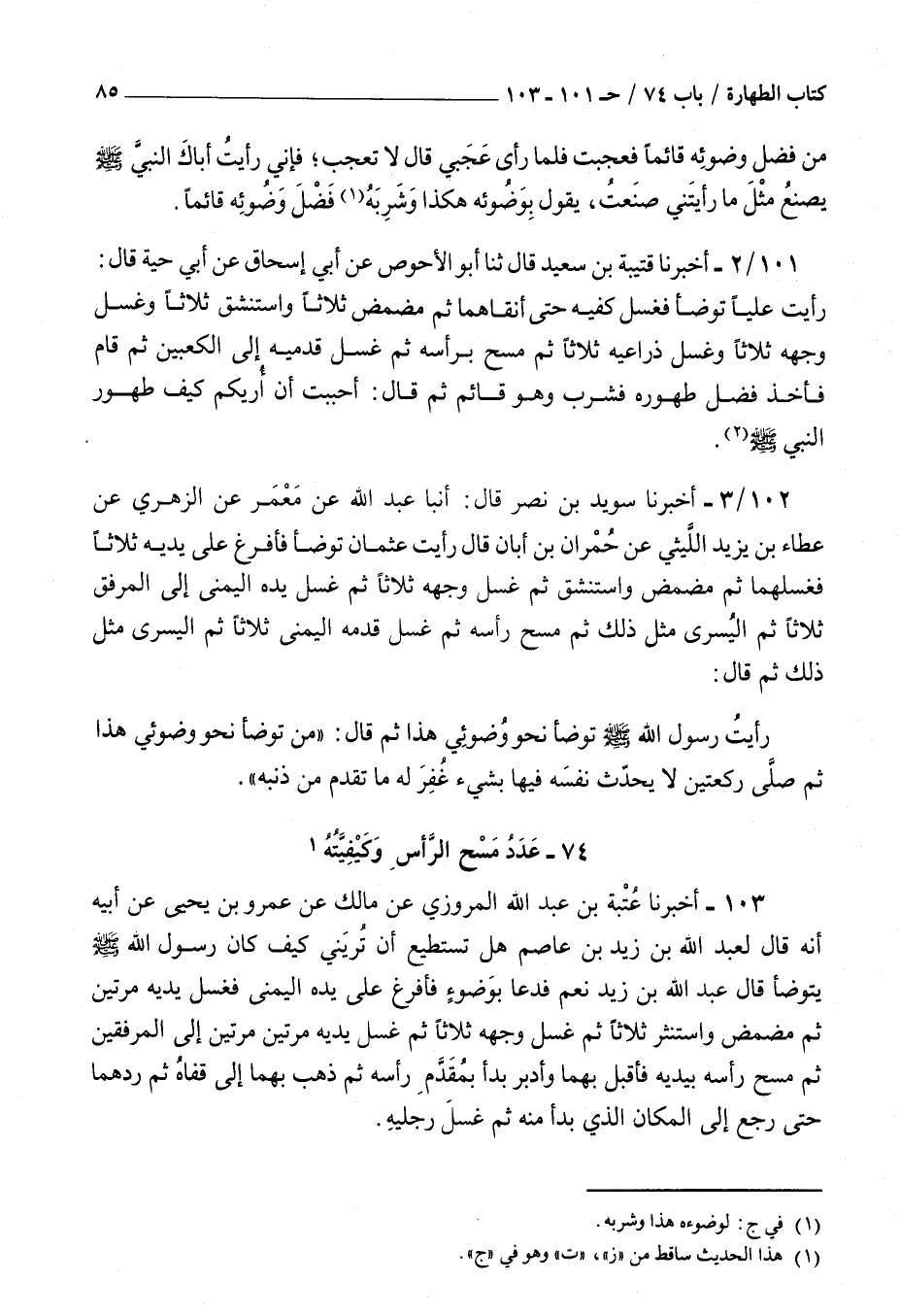 101 - أخبرنا قتيبة بن سعيد قال ثنا أبو الأحوص عن أبي إسحاق عن أبي حية قال : رأيت عليا توضأ فغسل كفيه حتى أنقاهما ثم مضمض ثلاثا واستنشق ثلاثا وغسل وجهه ثلاثا وغسل ذراعيه ثلاثا ثم مسح برأسه ثم غسل قدميه إلى الكعبين ثم قام فأخذ فضل طهوره فشرب وهو قائم ثم قال أحببت أن أريكم كيف طهور النبي صلى الله عليه و سلم