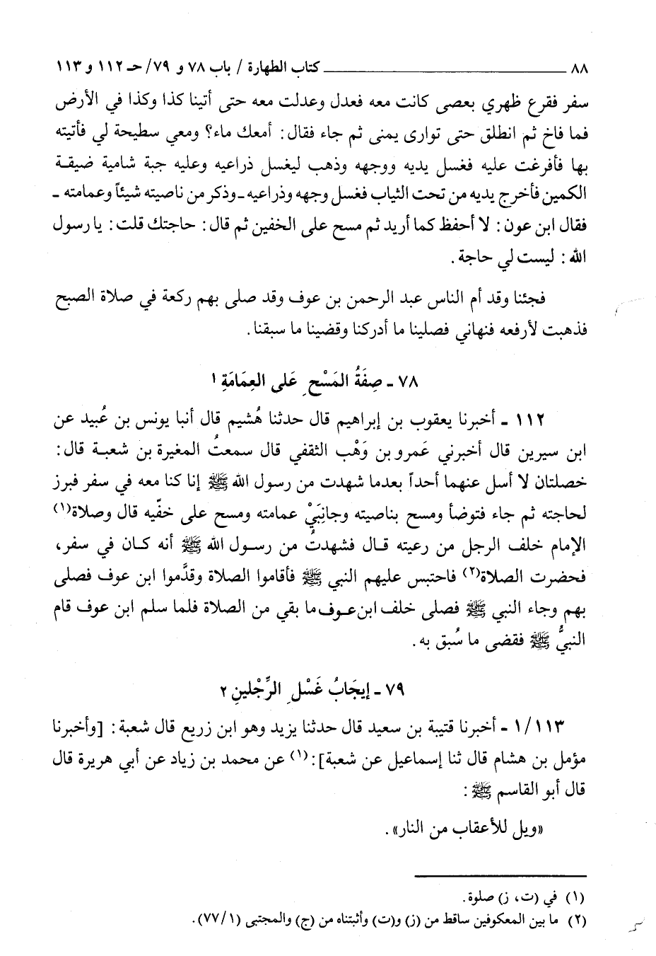 113 - أخبرنا قتيبة بن سعيد قال حدثنا يزيد وهو بن زريع قال شعبة وأخبرنا مؤمل بن هشام قال ثنا إسماعيل عن شعبة عن محمد بن زياد عن أبي هريرة قال قال أبو القاسم صلى الله عليه و سلم : ويل للأعقاب من النار