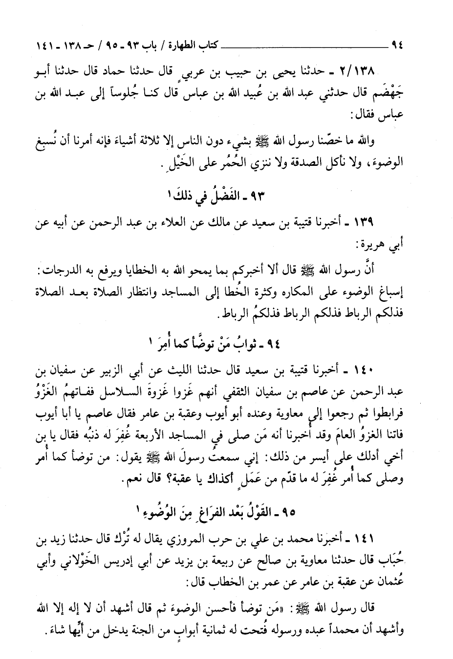 139 - أخبرنا قتيبة بن سعيد عن مالك عن العلاء بن عبد الرحمن عن أبيه عن أبي هريرة أن رسول الله صلى الله عليه و سلم قال : ألا أخبركم بما يمحو الله به الخطايا ويرفع به الدرجات إسباغ الوضوء على المكاره وكثرة الخطا إلى المساجد وانتظار الصلاة بعد الصلاة فذلكم الرباط فذلكم الرباط فذلكم الرباط
