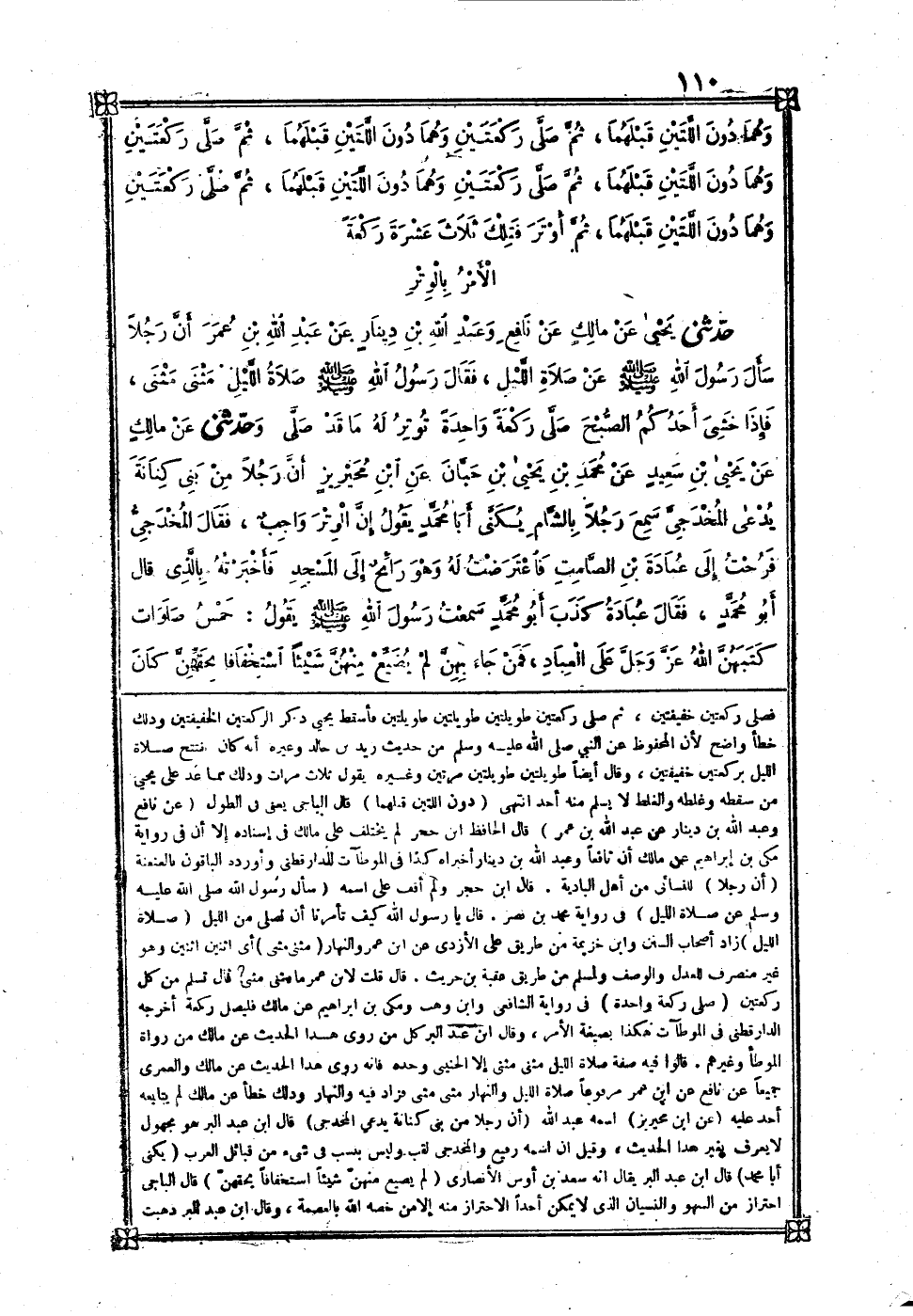 [267] عَن نَافِع وَعبد الله بن دِينَار عَن عبد الله بن عمر قَالَ الْحَافِظ بن حجر لم يخْتَلف على مَالك فِي إِسْنَاد إِلَّا أَن فِي رِوَايَة مكي بن إِبْرَاهِيم عَن مَالك أَن نَافِعًا وَعبد الله بن دِينَار أخبراه كَذَا فِي الموطآت للدارقطني وَأوردهُ الْبَاقُونَ بالعنعنة أَن رجلا للنسائي من أهل الْبَادِيَة قَالَ بن حجر وَلم أَقف على اسْمه سَأَلَ رَسُول الله صلى الله عَلَيْهِ وَسلم عَن صَلَاة اللَّيْل فِي رِوَايَة مُحَمَّد بن نصر قَالَ يَا رَسُول الله كَيفَ تَأْمُرنَا أَن نصلي من اللَّيْل صَلَاة اللَّيْل زَاد أَصْحَاب السّنَن وَابْن خُزَيْمَة من طَرِيق عَليّ الْأَزْدِيّ عَن بن عمر وَالنَّهَار مثنى مثنى أَي اثْنَيْنِ اثْنَيْنِ وَهُوَ غير منصرف للعدل وَالْوَصْف وَلمُسلم من طَرِيق عقبَة بن حُرَيْث قَالَ قلت لِابْنِ عمر مَا مثنى مثنى قَالَ تسلم من كل رَكْعَتَيْنِ صلى رَكْعَة وَاحِدَة فِي رِوَايَة الشَّافِعِي وَابْن وهب ومكي بن إِبْرَاهِيم عَن مَالك فَليصل رَكْعَة أخرجه الدَّارَقُطْنِيّ فِي الموطآت هَكَذَا بِصِيغَة الْأَمر وَقَالَ بن عبد الْبر كل من روى هَذَا الحَدِيث عَن مَالك من رُوَاة الْمُوَطَّأ وَغَيرهم قَالُوا فِيهِ صفة صَلَاة اللَّيْل مثنى مثنى إِلَّا الحنيني وَحده فَإِنَّهُ روى هَذَا الحَدِيث عَن مَالك والعمري جَمِيعًا عَن نَافِع عَن بن عمر مَرْفُوعا صَلَاة اللَّيْل وَالنَّهَار مثنى مثنى فَزَاد فِيهِ وَالنَّهَار وَذَلِكَ خطأ عَن مَالك لم يُتَابِعه أحد عَلَيْهِ