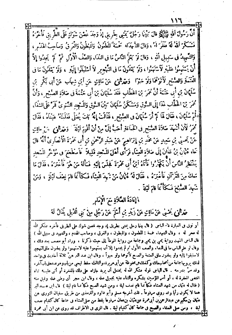 [293] قَالَ بَيْنَمَا رجل يمشي بطرِيق إِذْ وجد غُصْن شوك على الطَّرِيق فَأَخَّرَهُ فَشكر الله لَهُ فغفر لَهُ وَقَالَ الشُّهَدَاء خَمْسَة المطعون والمبطون والغرف وَصَاحب الْهدم والشهيد فِي سَبِيل الله قَالَ الْبَاجِيّ انْتَهَت رِوَايَة يحيى بن يحيى وَجَمَاعَة من رِوَايَة الْمُوَطَّأ إِلَى حَيْثُ ذكرنَا وَزَاد أَبُو مُصعب بعد ذَلِك وَقَالَ لَو علم النَّاس مَا فِي النداء والصف الأول ثمَّ لم يَجدوا إِلَّا أَن يستهموا عَلَيْهِ لاستهموا وَلَو يعلمُونَ مَا فِي التهجير لاستبقوا إِلَيْهِ وَلَو يعلمُونَ مَا فِي الْعَتَمَة وَالصُّبْح لأتوهما وَلَو حبوا وَقَالَ بن عبد الْبر هن ثَلَاثَة أَحَادِيث فِي وَاحِد لذَلِك يَرْوِيهَا جمَاعَة من أَصْحَاب مَالك وَكَذَلِكَ هِيَ مَحْفُوظَة عَن أبي هُرَيْرَة وَالثَّالِث سقط ليحيى من بَاب وَهُوَ عِنْده فِي بَاب آخر وَقد مر بشرحه قَالَ الْبَاجِيّ قَوْله فَشكر الله لَهُ يحْتَمل ان يُرِيد جازاه على ذَلِك بالمغفرة أَو اثنى عَلَيْهِ ثَنَاء اقْتضى الْمَغْفِرَة لَهُ أَو أَمر الْمُؤمنِينَ بشكره وَالثنَاء عَلَيْهِ بجميل فعله وَقَالَ بن حجر أَي رَضِي قعله وَقبل مِنْهُ