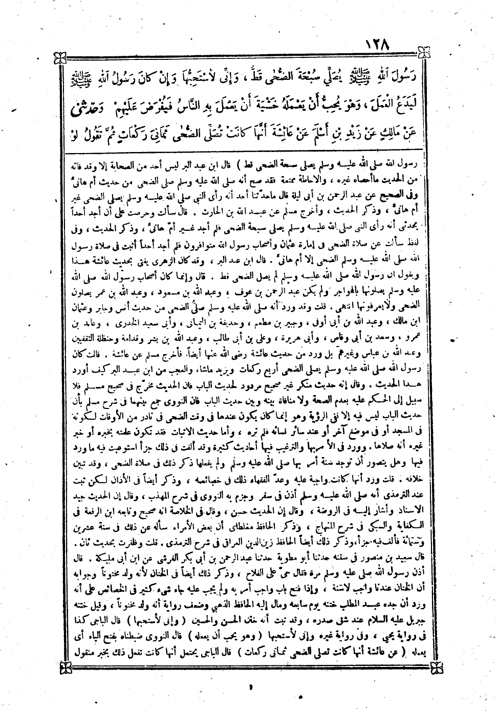 [357] عَن عَائِشَة زوج النَّبِي صلى الله عَلَيْهِ وَسلم أَنَّهَا قَالَت مَا رَأَيْت رَسُول الله صلى الله عَلَيْهِ وَسلم يُصَلِّي سبْحَة الضُّحَى قطّ قَالَ بن عبد الْبر لَيْسَ أحد من الصَّحَابَة إِلَّا وَقد فَاتَهُ من الحَدِيث مَا أَحْصَاهُ غَيره والاحاطة ممتنعة فقد صَحَّ أَنه صلى الله عَلَيْهِ وَسلم صلى الضُّحَى من حَدِيث أم هَانِئ وَفِي الصَّحِيح عَن عبد الرَّحْمَن بن أبي لَيْلَة قَالَ مَا حَدثنَا أحد أَنه رأى النَّبِي صلى الله عَلَيْهِ وَسلم يُصَلِّي الضُّحَى غير أم هَانِئ وَذكر الحَدِيث وَأخرج مُسلم عَن عبد الله بن الْحَارِث قَالَ سَأَلت وحرصت على أَن أجد أحدا يحدثني أَنه رأى النَّبِي صلى الله عَلَيْهِ وَسلم يُصَلِّي سبْحَة الضُّحَى فَلم أجد غير أم هَانِئ وَذكر الحَدِيث وَفِي لفظ سَأَلت عَن صَلَاة الضُّحَى فِي إِمَارَة عُثْمَان وَأَصْحَاب رَسُول الله متوافرون فَلم أجد أحدا أثبت فِي صَلَاة رَسُول الله صلى الله عَلَيْهِ وَسلم الضُّحَى إِلَّا أم هَانِئ قَالَ بن عبد الْبر وَقد كَانَ الزُّهْرِيّ يُفْتِي بِحَدِيث عَائِشَة هَذَا وَيَقُول ان رَسُول الله صلى الله عَلَيْهِ وَسلم لم يصل الضُّحَى قطّ قَالَ وَإِنَّمَا كَانَ أَصْحَاب رَسُول الله صلى الله عَلَيْهِ وَسلم يصلونها بالهواجر وَلم يكن عبد الرَّحْمَن بن عَوْف وَعبد الله بن مَسْعُود وَعبد الله بن عمر يصلونَ الضُّحَى وَلَا يعرفونها انْتهى قلت وَقد رَود أَنه صلى الله عَلَيْهِ وَسلم صلى الضُّحَى من ديث أنس وَجَابِر وَعُثْمَان بن مَالك وَعبد الله بن أبي أوفى وَجبير بن مطعم وَحُذَيْفَة بن الْيَمَانِيّ وَأبي سعيد الْخُدْرِيّ وعابد بن عَمْرو وَسعد بن أبي وَقاص وَأبي هُرَيْرَة وَعلي بن أبي طَالب وَعبد الله بن بشر وَقُدَامَة وحَنْظَلَة الثقفيين وَعبد الله بن عَبَّاس وَغَيرهم بل ورد من حَدِيث عَائِشَة رَضِي الله عَنْهَا أَيْضا فَأخْرج مُسلم عَن عَائِشَة قَالَت كَانَ رَسُول الله صلى الله عَلَيْهِ وَسلم يُصَلِّي الضُّحَى أَربع رَكْعَات وَيزِيد مَا شَاءَ وَالْعجب من بن عبد الْبر كَيفَ أورد هَذَا الحَدِيث وَقَالَ إِنَّه حَدِيث مُنكر غير صَحِيح مَرْدُود لحَدِيث الْبَاب فَإِن الحَدِيث مخرج فِي صَحِيح مُسلم فَلَا سَبِيل إِلَى الحكم عَلَيْهِ بِعَدَمِ الصِّحَّة وَلَا منافة بَينه وَبَين حَدِيث الْبَاب فَإِن النَّوَوِيّ جمع بَينهمَا فِي شرح مُسلم بِأَن حَدِيث الْبَاب لَيْسَ فِيهِ إِلَّا نفي الرُّؤْيَة وَهُوَ إِنَّمَا كَانَ يكون عِنْدهَا فِي وَقت الضُّحَى فِي نَادِر من الْأَوْقَات لكَونه فِي الْمَسْجِد أَو فِي مَوضِع آخر أَو عِنْد سَائِر نِسَائِهِ فَلم تره وَأما حَدِيث الاثبات فقد تكون عَلمته بِخَبَرِهِ أَو خبر غَيره أَنه صلاهَا وَورد فِي الْأَمر بهَا وَالتَّرْغِيب فِيهَا أَحَادِيث كَثِيرَة وَقد ألفت فِي ذل جزأ استوعبت فِيهِ مَا ورد فِيهَا وَهل يتَصَوَّر أَن تُوجد سنة أَمر بهَا صلى الله عَلَيْهِ وَسلم وَلم يَفْعَلهَا ذكر ذَلِك فِي صَلَاة الضُّحَى وَقد تبين خِلَافه قلت ورد أَنَّهَا كَانَت وَاجِبَة عَلَيْهِ وعد الْفُقَهَاء ذَلِك فِي خَصَائِصه وَذكر أَيْضا فِي الْأَذَان لَكِن ثَبت عِنْد التِّرْمِذِيّ أَنه صلى الله عَلَيْهِ وَسلم أذن فِي سفر وَجزم بِهِ النَّوَوِيّ فِي شرح الْمُهَذّب وَقَالَ إِن الحَدِيث جيد الْإِسْنَاد وَأَشَارَ إِلَيْهِ فِي الرَّوْضَة وَقَالَ إِن الحَدِيث حسن وَقَالَ فِي الْخُلَاصَة انه صَحِيح وَتَابعه بن الرّفْعَة فِي الْكِفَايَة والسبكي فِي شرح الْمِنْهَاج وَذكر الْحَافِظ مغلطاي أَن بعض الْأُمَرَاء سَأَلَهُ عَن ذَلِك فِي سنة عشْرين وسِتمِائَة فألف فِيهِ جزأ وَذكر ذَلِك أَيْضا الْحَافِظ زين الدّين الْعِرَاقِيّ فِي شرح التِّرْمِذِيّ قلت وظفرت بِحَدِيث ثَان قَالَ سعيد بن مَنْصُور فِي سنَنه حَدثنَا أَبُو مطوية حَدثنَا عبد الرَّحْمَن بن أبي بكر الْقرشِي عَن بن أبي 
