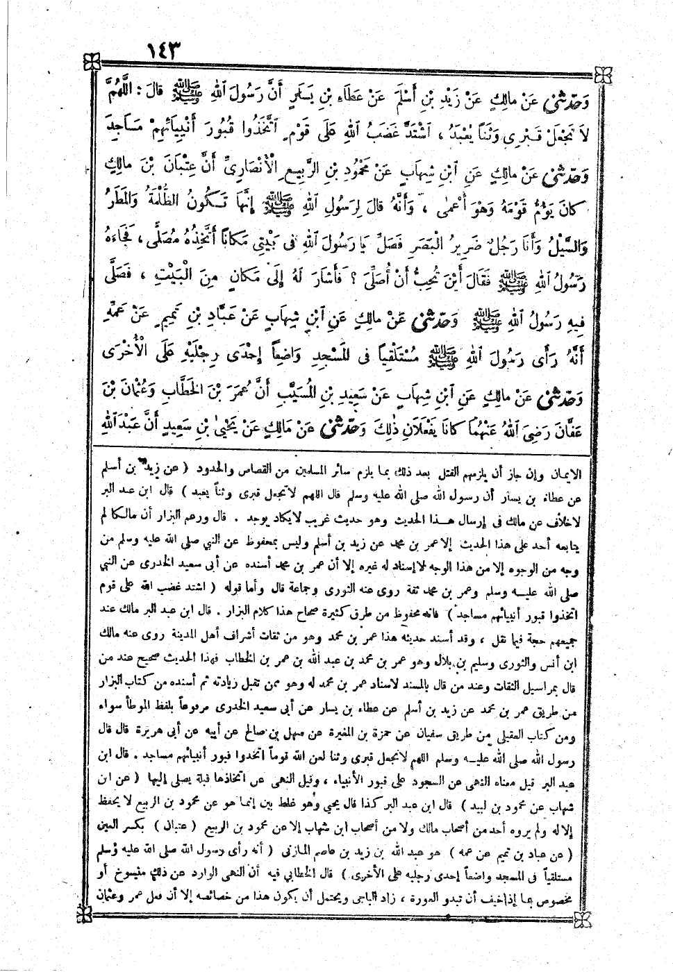 [414] عَن زيد بن اسْلَمْ عَن عَطاء بن يسَار أَن رَسُول الله صلى الله عَلَيْهِ وَسلم قَالَ اللَّهُمَّ لَا تجْعَل قَبْرِي وثنا يعبد قَالَ بن عبد الْبر لَا خلاف عَن مَالك فِي إرْسَال هَذَا الحَدِيث وَهُوَ حَدِيث غَرِيب لَا يكا د يُوجد قَالَ وَزعم الْبَزَّار أَن مَالِكًا لم يُتَابِعه أحد على هَذَا الحَدِيث إِلَّا عمر بن مُحَمَّد عَن زيد بن أسلم وَلَيْسَ بِمَحْفُوظ عَن النَّبِي صلى الله عَلَيْهِ وَسلم من وَجه من الْوُجُوه إِلَّا من هَذَا الْوَجْه لَا إِسْنَاد لَهُ غَيره إِلَّا أَن عمر بن مُحَمَّد أسْندهُ عَن أبي سعيد الْخُدْرِيّ عَن النَّبِي صلى الله عَلَيْهِ وَسلم وَعمر بن مُحَمَّد ثِقَة روى عَنهُ الثَّوْريّ وَجَمَاعَة قَالَ وَأما قَوْله اشْتَدَّ غضب الله على قوم اتَّخذُوا قُبُور أَنْبِيَائهمْ مَسَاجِد فَإِنَّهُ مَحْفُوظ من طرق كَثِيرَة صِحَاح هَذَا كَلَام الْبَزَّار قَالَ بن عبد الْبر مَالك عِنْد جمعهم حجَّة فِيمَا نقل وَقد أسْند حَدِيثه هَذَا عمر بن مُحَمَّد وَهُوَ من ثِقَات أَشْرَاف أهل الْمَدِينَة روى عَنهُ مَالك بن أنس وَالثَّوْري وسليم بن بِلَال وَهُوَ عمر بن مُحَمَّد بن عبد الله بن عمر بن الْخطاب فَهَذَا الحَدِيث صَحِيح عِنْد من قَالَ بمراسيل الثِّقَات وَعند من قَالَ بالمسند لاسناد عمر بن مُحَمَّد لَهُ وَهُوَ مِمَّن تقبل زِيَادَته ثمَّ أسْندهُ من كتاب الْبَزَّار من طَرِيق عمر بن مُحَمَّد عَن زيد بن اسْلَمْ عَن عَطاء بن يسَار عَن أبي سعيد الْخُدْرِيّ مَرْفُوعا بِلَفْظ الْمُوَطَّأ سَوَاء وَمن كتاب الْعقيلِيّ من طَرِيق سُفْيَان عَن حَمْزَة بن الْمُغيرَة عَن سهل بن صَالح عَن أَبِيه عَن أبي هُرَيْرَة قَالَ قَالَ رَسُول الله صلى الله عَلَيْهِ وَسلم اللَّهُمَّ لَا تجْعَل قَبْرِي وثنا لعن الله قوما اتَّخذُوا قُبُور أَنْبِيَائهمْ مَسَاجِد قَالَ بن عبد الْبر قيل مَعْنَاهُ النَّهْي عَن السُّجُود على قُبُور الْأَنْبِيَاء وَقيل النَّهْي عَن اتخاذها قبْلَة يصلى إِلَيْهَا