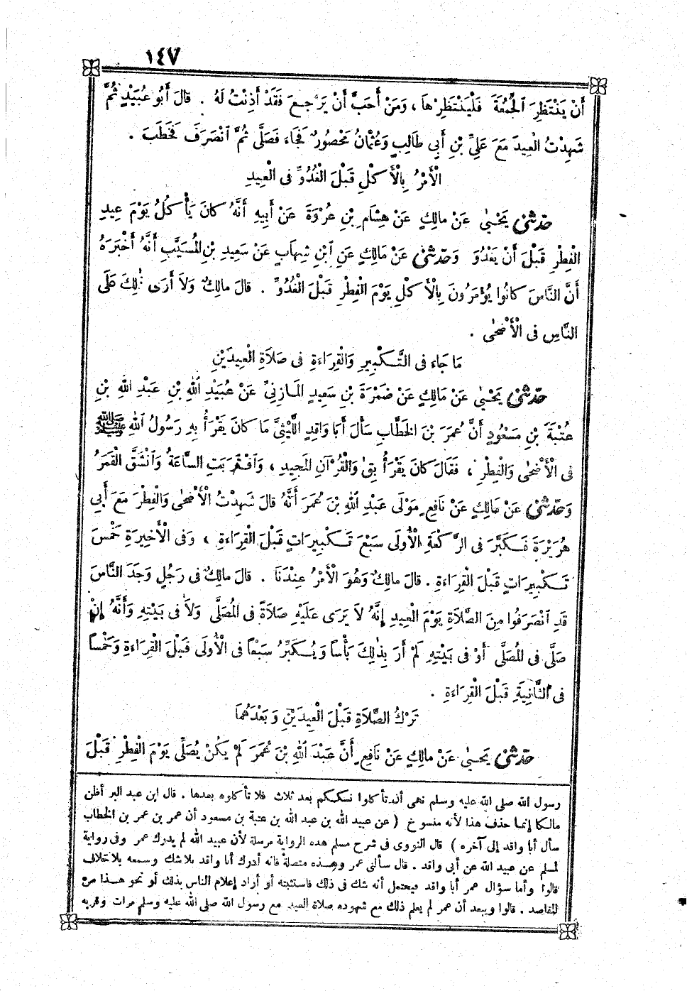 [429] عَن أبي عبيد مولى بن أَزْهَر اسْم أبي عبيد سعد بن عبيد وَابْن أَزْهَر عبد الرَّحْمَن بن أَزْهَر بن عَوْف بن أخي عبد الرَّحْمَن بن عَوْف شهِدت الْعِيد مَعَ عمر بن الْخطاب فصلى زَاد عبد الرَّزَّاق عَن معمر عَن الزُّهْرِيّ قبل أَن يخْطب بِلَا أَذَان وَلَا إِقَامَة ثمَّ انْصَرف فَخَطب زَاد عبد الرَّزَّاق فَقَالَ يَا أَيهَا النَّاس أَن رَسُول الله صلى الله عَلَيْهِ وَسلم نهى أَن تَأْكُلُوا نسككم بعد ثَلَاث فَلَا تأكلوه بعْدهَا قَالَ بن عبد الْبر أَظن مَالِكًا إِنَّمَا حذف هَذَا لِأَنَّهُ مَنْسُوخ