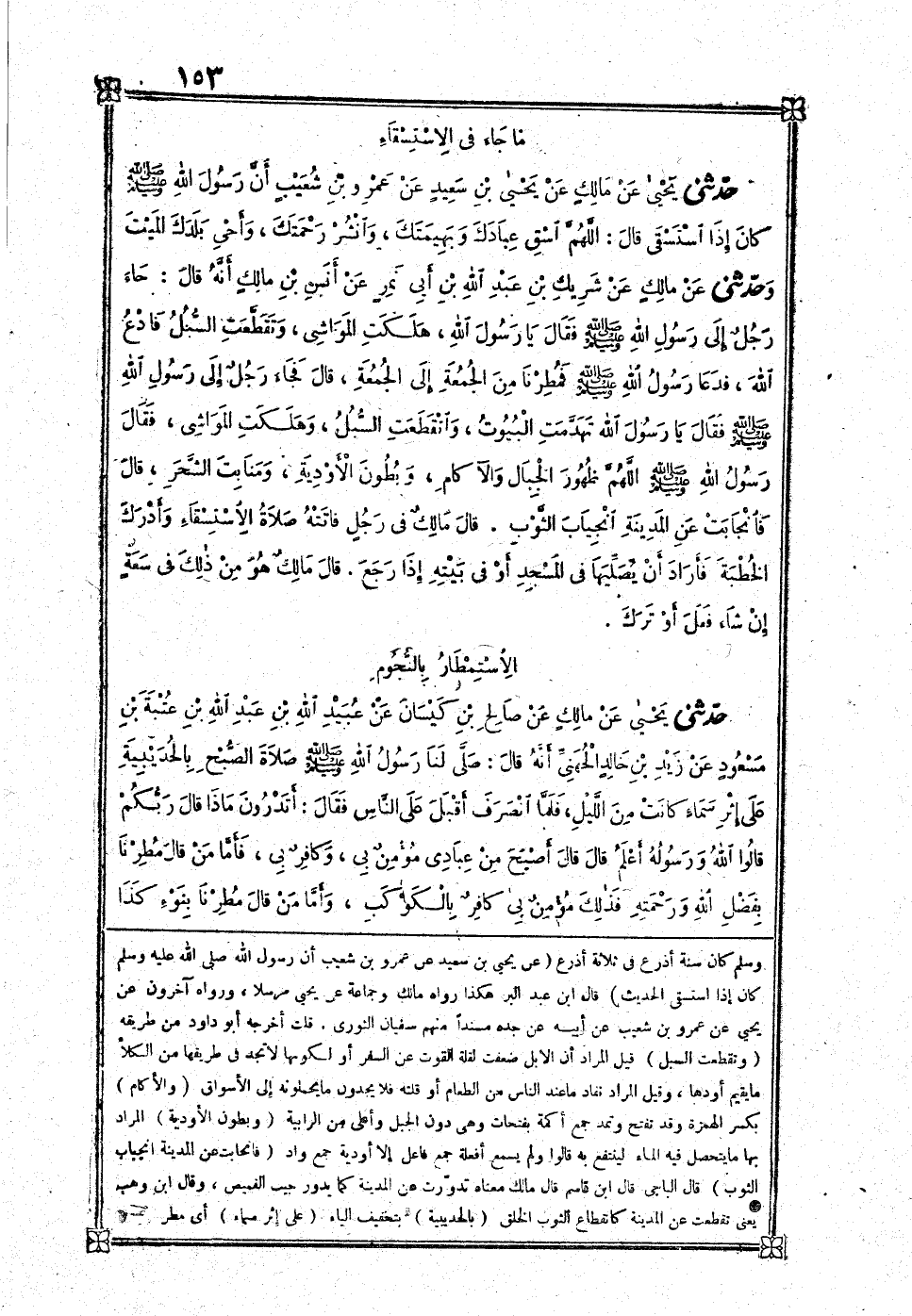 [448] خرج رَسُول الله صلى الله عَلَيْهِ وَسلم إِلَى الْمصلى فَاسْتَسْقَى زَاد بن عُيَيْنَة عَن عبد الله بن أبي بكر وَصلى رَكْعَتَيْنِ وحول رِدَاءَهُ ذكر الْوَاقِدِيّ أَن طول رِدَائه صلى الله عَلَيْهِ وَسلم كَانَ سِتَّة أَذْرع فِي ثَلَاثَة أَذْرع عَن يحيى بن سعيد عَن عَمْرو بن شُعَيْب أَن رَسُول الله صلى الله عَلَيْهِ وَسلم كَانَ إِذا استسقى الحَدِيث قَالَ بن عبد الْبر هَكَذَا رَوَاهُ مَالك وَجَمَاعَة عَن يحيى مُرْسلا وَرَوَاهُ آخَرُونَ عَن يحيى عَن عَمْرو بن شُعَيْب عَن أَبِيه عَن جده مُسْندًا مِنْهُم سُفْيَان النَّوَوِيّ قلت أخرجه أَبُو دَاوُد من طَرِيقه