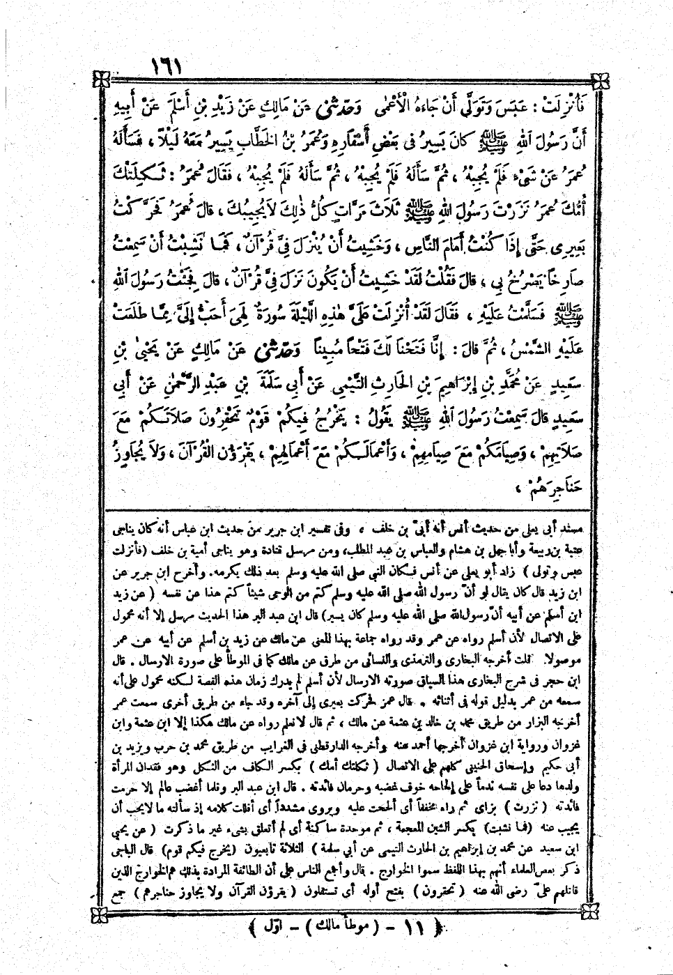[477] عَن زيد بن أسلم عَن أَبِيه أَن رَسُول الله صلى الله عَلَيْهِ وَسلم كَانَ يسير قَالَ بن عبد الْبر هَذَا الحَدِيث مُرْسل إِلَّا انه مَحْمُول على الِاتِّصَال لِأَن أسلم رَوَاهُ عَن عمر وَقد رَوَاهُ جمَاعَة بِهَذَا الْمَعْنى عَن مَالك عَن زيد بن أسلم عَن أَبِيه عَن عمر مَوْصُولا قلت أخرجه البُخَارِيّ وَالتِّرْمِذِيّ وَالنَّسَائِيّ من طرق عَن مَالك كَمَا فِي الْمُوَطَّأ على صُورَة الْإِرْسَال قَالَ بن حجر فِي شرح البُخَارِيّ هَذَا السِّيَاق صورته الْإِرْسَال لِأَن أسلم لم يدْرك زمَان هَذِه الْقِصَّة لكنه مَحْمُول على أَنه سَمعه من عمر بِدَلِيل قَوْله فِي أَثْنَائِهِ قَالَ عمر فحركت بَعِيري إِلَى آخِره وَقد جَاءَ من طَرِيق أُخْرَى سَمِعت عمر أخرجه الْبَزَّار من طَرِيق مُحَمَّد بن خَالِد بن عَثْمَة عَن مَالك ثمَّ قَالَ لَا نعلم رَوَاهُ عَن مَالك هَكَذَا إِلَّا بن عَثْمَة وَابْن غَزوَان وَرِوَايَة بن غَزوَان أخرجهَا أَحْمد عَنهُ وَأخرجه الدَّارَقُطْنِيّ فِي الغرايب من طَرِيق مُحَمَّد بن حَرْب وَيزِيد بن أبي حَكِيم وَإِسْحَاق الحنيني كلهم على الِاتِّصَال ثكلتك أمك بِكَسْر الْكَاف من الشكل وَهُوَ فقدان الْمَرْأَة وَلَدهَا دَعَا على نَفسه ندما على إلحاحه خوف غَضَبه وحرمان فَائِدَته قَالَ بن عبد الْبر وقلما أغضب عَالم إِلَّا حرمت فَائِدَته نزرت بزاي ثمَّ رَاء مخففا أَي ألححت عَلَيْهِ ويروى مشددا أَي أقللت كَلَامه إِذْ سَأَلته مَا لَا يحب أَن يُجيب عَنهُ فَمَا نشبت بِكَسْر الشين الْمُعْجَمَة ثمَّ مُوَحدَة سَاكِنة أَي لم أتعلق بِشَيْء غير مَا ذكرت