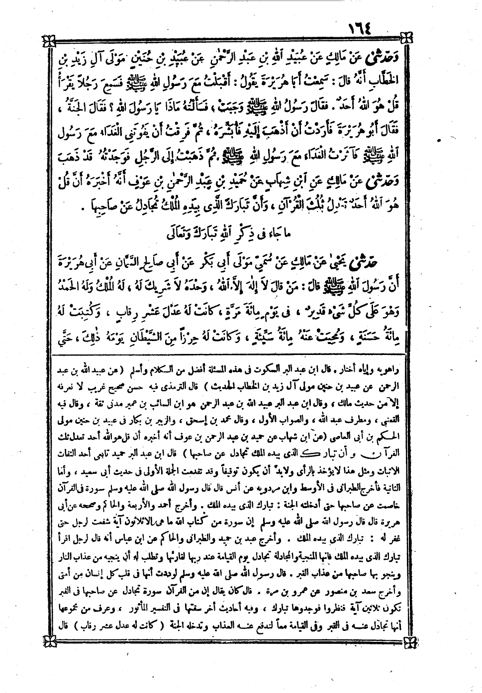[487] عَن بن شهَاب عَن حميد بن عبد الرَّحْمَن بن عَوْف أَنه أخبرهُ أَن قل هُوَ الله أحد تعدل ثلث الْقُرْآن وَإِن تبَارك الَّذِي بِيَدِهِ الْملك تجَادل عَن صَاحبهَا قَالَ بن عبد الْبر حميد تَابِعِيّ أحد الثِّقَات الاثبات ومث لهَذَا لَا يُؤْخَذ بِالرَّأْيِ وَلَا بُد أَن يكون توقيفا وَقد تقدّمت الْجُمْلَة الأولى فِي حَدِيث أبي سعيد واما الثَّانِيَة فَأخْرج الطَّبَرَانِيّ فِي الْأَوْسَط وَابْن مرْدَوَيْه عَن أنس قَالَ قَالَ رَسُول الله صلى الله عَلَيْهِ وَسلم سُورَة فِي الْقُرْآن خَاصَمت عَن صَاحبهَا حَتَّى أدخلته الْجنَّة تبَارك الَّذِي بِيَدِهِ الْملك وَأخرج أَحْمد وَالْأَرْبَعَة وَالْحَاكِم وَصَححهُ عَن أبي هُرَيْرَة قَالَ قَالَ رَسُول الله صلى الله عَلَيْهِ وَسلم أَن سُورَة من كتاب الله مَا هِيَ إِلَّا ثَلَاثُونَ آيَة شفعت لرجل حَتَّى غفر لَهُ تبَارك الَّذِي بِيَدِهِ الْملك وَأخرج عبد بن حميد وَالطَّبَرَانِيّ وَالْحَاكِم عَن بن عَبَّاس أَنه قَالَ لرجل اقْرَأ تبَارك الَّذِي بِيَدِهِ الْملك فانها المنجية والمجادلة تجَادل يَوْم الْقِيَامَة عِنْد رَبهَا لِقَارِئِهَا وتطلب لَهُ أَن ينجيه من عَذَاب النَّار وينجو بهَا صَاحبهَا من عَذَاب الْقَبْر قَالَ رَسُول الله صلى الله عَلَيْهِ وَسلم لَوَدِدْت أَنَّهَا فِي قلب كل إنسا من أمتِي وَأخرج سعد بن مَنْصُور عَن عَمْرو بن مرّة قَالَ كَانَ يُقَال إِن من الْقُرْآن سُورَة تجَادل عَن صَاحبهَا فِي الْقَبْر تكون ثَلَاثِينَ آيَة فنظروا فوجدوها تبَارك وَفِيه أَحَادِيث أخر سقتها فِي التَّفْسِير الْمَأْثُور وَعرف من مجموعها أَنَّهَا تجَادل عَنهُ فِي الْقَبْر وَفِي الْقِيَامَة مَعًا لتدفع عَنهُ الْعَذَاب وتدخله الْجنَّة