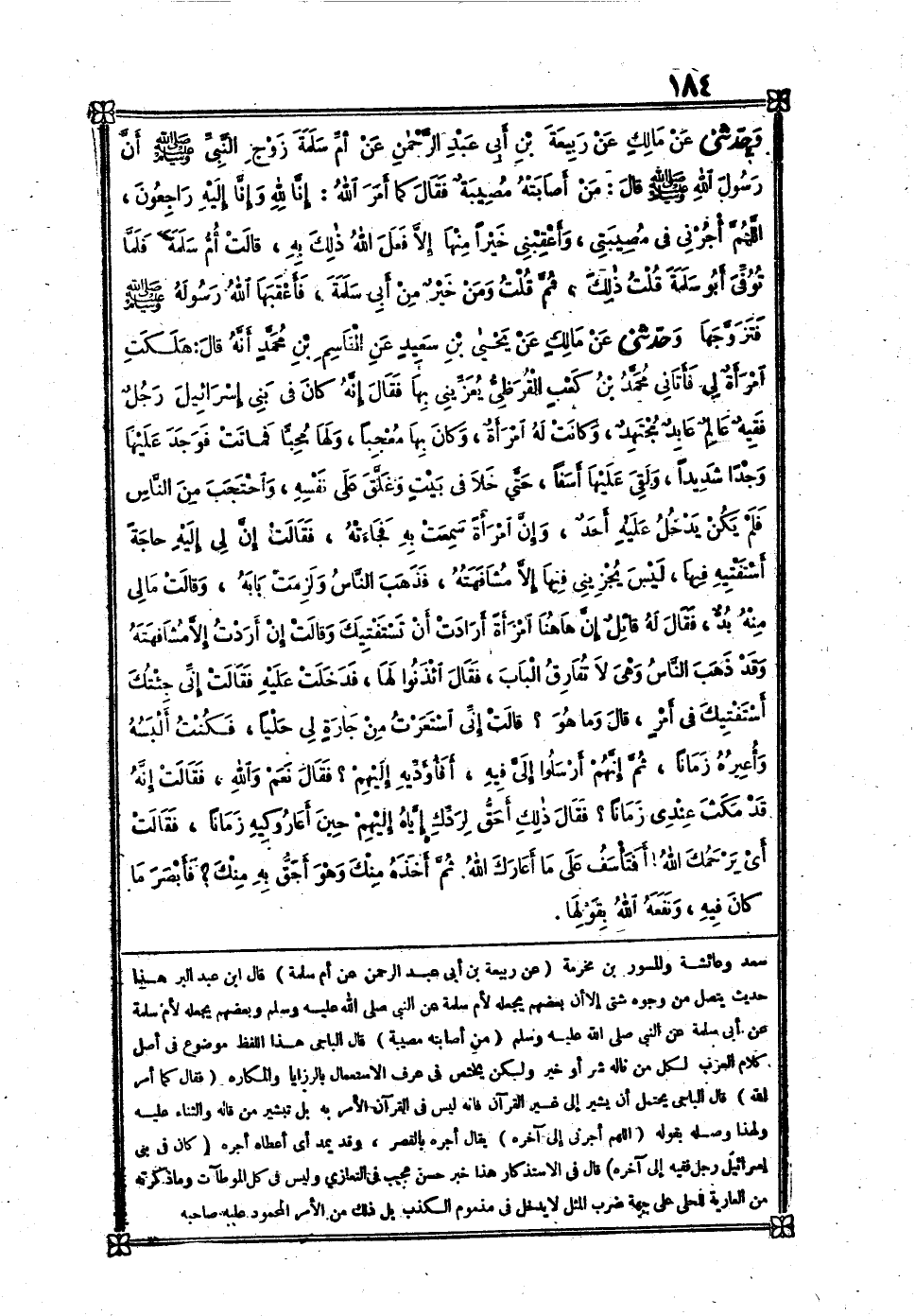 [560] عَن ربيعَة بن أبي عبد الرَّحْمَن عَن أم سَلمَة قَالَ بن عبد الْبر هَذَا حَدِيث يتَّصل من وُجُوه شَتَّى إِلَّا ان بَعضهم يَجعله لأم سَلمَة عَن النَّبِي صلى الله عَلَيْهِ وَسلم وَبَعْضهمْ يَجعله لأم سَلمَة عَن أبي سَلمَة عَن النَّبِي صلى الله عَلَيْهِ وَسلم من أَصَابَته مُصِيبَة قَالَ الْبَاجِيّ هَذَا اللَّفْظ مَوْضُوع فِي أصل كَلَام لعرب لكل من قَالَه شَرّ أَو خير وَلَكِن يخْتَص فِي عرف الِاسْتِعْمَال بالرزايا والمكاره فَقَالَ كَمَا أَمر الله قَالَ الْبَاجِيّ يحْتَمل أَن يُشِير إِلَى غير الْقُرْآن فَإِنَّهُ لَيْسَ فِي الْقُرْآن الْأَمر بِهِ بل تبشير من قَالَه وَالثنَاء عَلَيْهِ وَلِهَذَا وَصله بقوله اللَّهُمَّ أجرني إِلَى آخِره يُقَال أجره بِالْقصرِ وَقد يمد أَي أعطَاهُ أجره