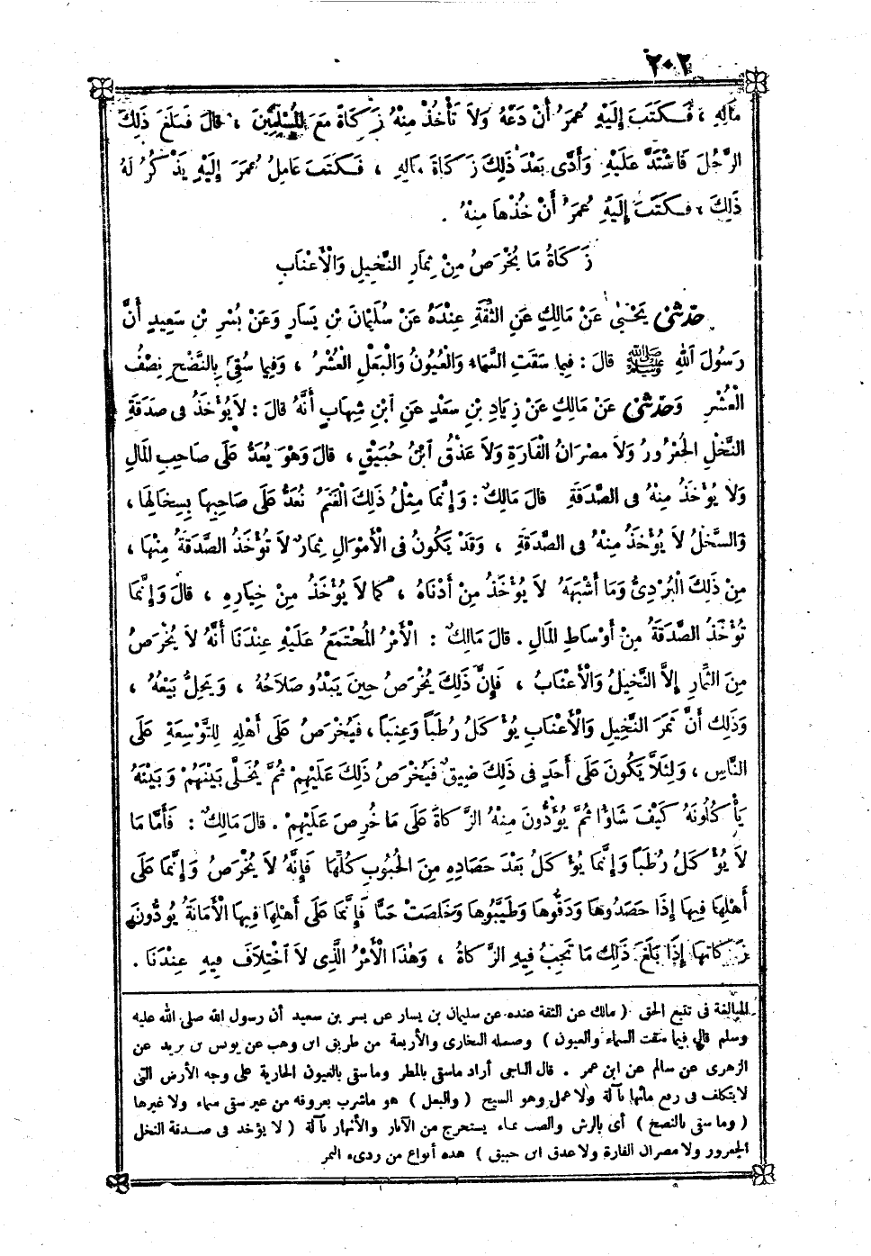 [608] مَالك عَن الثِّقَة عِنْده عَن سُلَيْمَان بن يسَار عَن بسر بن سعيد أَن رَسُول الله صلى الله عَلَيْهِ وَسلم قَالَ فِيمَا سقت السَّمَاء والعيون وَصله البُخَارِيّ وَالْأَرْبَعَة من طَرِيق بن وهب عَن يُونُس بن يزِيد عَن الزُّهْرِيّ عَن سَالم عَن بن عمر قَالَ الْبَاجِيّ أَرَادَ مَا سقِِي بالمطر وَمَا سقِِي بالعيون الْجَارِيَة على وَجه الأَرْض الَّتِي لَا يتَكَلَّف فِي رفع مَائِهَا بِآلَة وَلَا عمل وَهُوَ السيح والبعل هُوَ مَا شرب بعروقه من غير سقِِي سَمَاء وَلَا غَيرهَا وَمَا سقِِي بالنضح أَي بالرش والصب بِمَاء يسْتَخْرج من الْآبَار والأنهار بِآلَة
