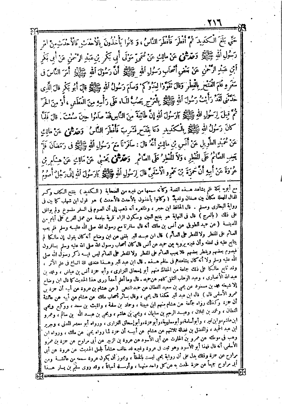 [652] عَن حميد الطَّوِيل عَن أنس بن مَالك أَنه قَالَ سافرنا مَعَ رَسُول الله صلى الله عَلَيْهِ وَسلم فَلم يعب الصَّائِم على الْمُفطر وَلَا الْمُفطر على الصَّائِم قَالَ بن عبد الْبر بَلغنِي عَن بن وضاح أَنه كَانَ يَقُول إِن مَالِكًا لم يُتَابع عَلَيْهِ فِي لَفظه وَإِن غَيره يرويهِ عَن حميد عَن أنس قَالَ كَانَ أَصْحَاب رَسُول الله صلى الله عَلَيْهِ وَسلم يسافرون فيصوم بضعهم وَيفْطر بَعضهم فَلَا يعيب الصَّائِم على الْمُفطر وَلَا الْمُفطر على الصَّائِم لَيْسَ فِيهِ ذكر رَسُول الله صلى الله عَلَيْهِ وَسلم وَلَا أَنه كَانَ يشاهدهم فِي حَالهم هَذِه قَالَ بن عبد الْبر وَهَذَا عِنْدِي قلَّة اتساع فِي علم الْأَثر وَقد تَابع مَالِكًا على ذَلِك جمَاعَة من الْحفاظ مِنْهُم أَبُو إِسْحَاق الْفَزارِيّ وَأَبُو حَمْزَة أنس بن عِيَاض وَمُحَمّد بن عبد الله الْأنْصَارِيّ وَعبد الْوَهَّاب الثَّقَفِيّ كلهم عَن حميد قَالَ وَمَا أعلم أحدا روى هَذَا الحَدِيث كَمَا قَالَ بن وضاح إِلَّا شَيْخه مُحَمَّد بن مَسْعُود عَن يحيى بن سعيد الْقطَّان عَن حميد انْتهى