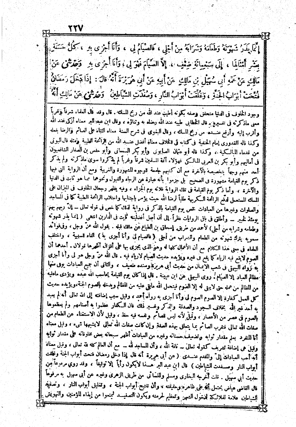 [683] لخلوف فَم الصَّائِم بِضَم الْخَاء الْمُعْجَمَة وَاللَّام وَسُكُون الْوَاو وَفَاء وَقَالَهُ بَعضهم بِفَتْح الْخَاء فَقيل هُوَ خطأ وَقيل لُغَة قَليلَة وَهُوَ تغير رَائِحَة الْفَم أطيب عِنْد الله من ريح الْمسك اخْتلف فِي مَعْنَاهُ لِأَنَّهُ تَعَالَى منزه عَن استطابة الروائح فَقَالَ الْمَازرِيّ هُوَ مجَاز لِأَنَّهُ جرت الْعَادة بتقريب الروائح الطّيبَة منا فاستعير ذَلِك لتقريب الصَّوْم من الله فَالْمَعْنى انه أطيب عِنْد الله من ريح الْمسك عنْدكُمْ أَي يقرب إِلَيْهِ أَكثر من تقريب الْمسك إِلَيْكُم وَقيل إِن ذَلِك فِي حق الْمَلَائِكَة وانهم يستطيبون ريح الخلوف أَكثر مِمَّا يستطيبون ريح الْمسك وَقيل الْمَعْنى أَن الله يجْزِيه فِي الْآخِرَة فَتكون نكهته أطيب من ريح الْمسك كَمَا يَأْتِي المكلوم وريح جرحه يفوح مسكا وَقيل الْمَعْنى ان الخلوف أَكثر ثَوابًا من الْمسك الْمَنْدُوب إِلَيْهِ فِي الْجمع والأعياد ومجالس الذّكر وَالْخَيْر وَصَححهُ النَّوَوِيّ وَنقل القَاضِي حُسَيْن فِي تَعْلِيقه أَن للطاعات يَوْم الْقِيَامَة ريحًا يفوح قَالَ فرائحة الصّيام فِيهَا بَين الْعِبَادَات كالمسك فَائِدَة قَالَ النَّوَوِيّ فِي شرح الْمُهَذّب كَانَ وَقع نزاع بَين الشَّيْخ أبي عَمْرو بن الصّلاح وَالشَّيْخ أبي مُحَمَّد بن عبد السَّلَام فِي أَن هَذَا الطّيب فِي الدُّنْيَا وَالْآخِرَة أم فِي الْآخِرَة خَاصَّة فَقَالَ بن عبد السَّلَام فِي الْآخِرَة خَاصَّة لِأَن فِي رِوَايَة لمُسلم أطيب عِنْد الله من ريح الْمسك يَوْم الْقِيَامَة وَقَالَ بن الصّلاح هُوَ عَام فِي الدُّنْيَا وَالْآخِرَة وَاسْتدلَّ بأَشْيَاء كَثِيرَة مِنْهَا مَا فِي رِوَايَة لِابْنِ حبَان لخلوف فَم الصَّائِم حِين يخلف أطيب عِنْد الله من ريح الْمسك وروى الْحسن بن سُفْيَان فِي مُسْنده من حَدِيث جَابر أَعْطَيْت أمتِي فِي شهر رَمَضَان خمْسا قَالَ وَأما الثَّانِيَة فانهم يمسون وخلوف أَفْوَاههم أطيب عِنْد الله من ريح الْمسك حسنه أَبُو بكر السَّمْعَانِيّ فِي أَمَالِيهِ وكل وَاحِد من الْحَدِيثين صَرِيح بِأَنَّهُ فِي وَقت وجود الخلوف فِي الدُّنْيَا مُتَحَقق وَصفه بِكَوْنِهِ أطيب عِنْد الله من ريح الْمسك قَالَ وَقد قَالَ الْعلمَاء شرقا وغربا معنى مَا ذكرته فِي تَفْسِيره قَالَ الْخطابِيّ طيبه عِنْد الله رِضَاهُ بِهِ وثناؤه وَقَالَ بن عبد الْبر مَعْنَاهُ أزكى عِنْد الله وَأقرب إِلَيْهِ وَأَرْفَع عِنْده من ريح الْمسك وَقَالَ الْبَغَوِيّ فِي شرح السّنة مَعْنَاهُ الثَّنَاء على الصَّائِم وَالرِّضَا بِفِعْلِهِ وَكَذَا قَالَه الْقَدُورِيّ إِمَام الْحَنَفِيَّة فِي كِتَابه فِي الْخلاف مَعْنَاهُ أفضل عِنْد الله من الرَّائِحَة الطّيبَة وَمثله قَالَ الْبونِي من قدماء الْمَالِكِيَّة وَكَذَا قَالَه أَبُو عُثْمَان الصَّابُونِي وَأَبُو بكر السَّمْعَانِيّ وَأَبُو حَفْص بن الصفار الشافعيون فِي أماليهم وَأَبُو بكر بن الْعَرَبِيّ الْمَالِكِي فَهَؤُلَاءِ أَئِمَّة الْمُسلمين شرقا وغربا لم يذكرُوا سوى مَا ذكرته وَلم يذكر أحد مِنْهُم وَجها بتخصيصه بِالآخِرَة مَعَ أَن كتبهمْ جَامِعَة للوجوه الْمَشْهُورَة والغريبة وَمَعَ أَن الرِّوَايَة الَّتِي فِيهَا ذكر يَوْم الْقِيَامَة مَشْهُورَة فِي الصَّحِيح بل جزموا بِأَنَّهُ عبارَة عَن الرَّجَاء وَالْقَبُول وَنَحْوهمَا مِمَّا هُوَ ثَابت فِي الدُّنْيَا وَالْآخِرَة وَأما ذكر يَوْم الْقِيَامَة فِي تِلْكَ الرِّوَايَة فُلَانُهُ يَوْم الْجَزَاء وَفِيه يظْهر رُجْحَان الخلوف فِي الْمِيزَان على الْمسك الْمُسْتَعْمل لدفع الرَّائِحَة الكريهة طلبا لرضا الله حَيْثُ يُؤمر باجتنابها واجتلاب الرَّائِحَة الطّيبَة كَمَا فِي الْمَسَاجِد والصلوات وَغَيرهَا من الْعِبَادَات فَخص يَوْم الْقِيَامَة بِالذكر فِي رِوَايَة لذَلِك كَمَا خص فِي قَوْله تَعَالَى إِنَّ ر