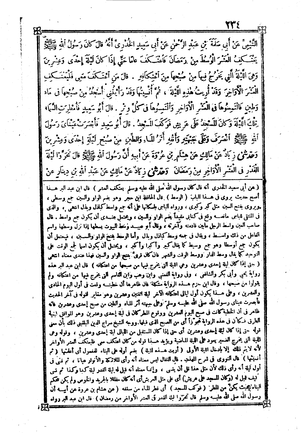 [692] عَن أبي سعيد الْخُدْرِيّ أَنه قَالَ كَانَ رَسُول الله صلى الله عَلَيْهِ وَسلم يعْتَكف الْعشْر قَالَ بن عبد الْبر هَذَا أصح حَدِيث يرْوى فِي هَذَا الْبَاب الْوسط قَالَ الْحَافِظ بن حجر وَهُوَ بِضَم الْوَاو وَالسِّين جمع وسطى ويروى بِفَتْح السِّين مثل كبر وكبرى وَرَوَاهُ الْبَاجِيّ بإسكانها على أَنه جمع وَاسِط كباذل وبذل انْتهى وَالَّذِي فِي المتقي للباجي مَا نَصه وَقع فِي كتابي مُقَيّدا بِضَم الْوَاو والشين وَيحْتَمل عِنْدِي أَن يكون جمع وَاسِط قَالَ صَاحب الْعين وَاسِط الرجل مَا بَين قادمته وآخرته وَقَالَ أَبُو عبيد وسط الْبيُوت يسطها إِذا نزل وَسطهَا وَاسم الْفَاعِل من ذَلِك وَاسِط وَيُقَال فِي جمعه وسط كباذل وبذل وَأما الْوسط بِفَتْح الْوَاو وَالسِّين فَيحْتَمل أَن يكون جمع أوسطا وَهُوَ جمع وسيط كَمَا يُقَال كَبِير وأكبرا وأكبر وَيحْتَمل أَن يكون اسْما لجمع الْوَقْت على التَّوْحِيد كَمَا يُقَال وسط الدَّار ووسط الْوَقْت والشهر فَإِن كَانَ قرئَ بِفَتْح الْوَاو وَالسِّين فَهَذَا عِنْدِي مَعْنَاهُ انْتهى حَتَّى إِذا كَانَ لَيْلَة إِحْدَى وَعشْرين وَهِي اللَّيْلَة الَّتِي يخرج فِيهَا من صبحها من اعْتِكَافه قَالَ بن عبد الْبر هَذِه رِوَايَة يحيى وَأبي كرّ وَالشَّافِعِيّ وَفِي رِوَايَة القعْنبِي وَابْن وهب وَابْن الْقَاسِم الَّتِي يخرج فهيا من اعْتِكَافه وَلم يَقُولُوا من صبحها وَقَالَ بن حزم هَذِه الرِّوَايَة مشكلة فَإِن ظَاهرهَا أَن خطبَته وَقعت فِي أول الْيَوْم الْحَادِي والعشري وعَلى هَذَا يكون أول ليَالِي اعْتِكَافه الآخر لَيْلَة اثْنَتَيْنِ وَعشْرين وَهُوَ مُغَاير لقَوْله فِي آخر الحَدِيث فَأَبْصَرت عَيْنَايَ رَسُول الله صلى الله عَلَيْهِ وَسلم وعَلى جَبهته أثر المَاء والطين من صبح إِحْدَى وَعشْرين فَإِنَّهُ ظَاهر فِي أَن الْخطْبَة كَانَت فِي صبح الْيَوْم العشري وَوُقُوع الْمَطَر كَانَ فِي لَيْلَة إِحْدَى وَعشْرين وَهُوَ الْمُوَافق لبَقيَّة الطّرق فَكَأَن فِي هَذِه الرِّوَايَة تجوزا أَي من الصُّبْح الَّذِي قبلهَا وَوجه الشَّيْخ سراج الدّين البُلْقِينِيّ ذَلِك بِأَن معنى قَوْله حَتَّى إِذا كَانَ لَيْلَة إِحْدَى وَعشْرين أَي حَتَّى إِذا كَانَ الْمُسْتَقْبل من اللَّيَالِي لَيْلَة إِحْدَى وَعشْرين وَقَوله وَهِي اللَّيْلَة الَّتِي يخرج الضَّمِير يعود على اللَّيْلَة الْمَاضِيَة وَيُؤَيّد هَذَا قَوْله من كَانَ اعْتكف معي فليعتكف الْعشْر الأوار لِأَنَّهُ لَا يتم ذَلِك إِلَّا بِإِدْخَال اللَّيْلَة الأولى أريت هَذِه اللَّيْلَة بِضَم أَوله على الْبناء للْمَفْعُول أَي أعلمتها ثمَّ أنسيتها قَالَ النَّوَوِيّ فِي شرح الْمُهَذّب قَالَ النفال لَيْسَ مَعْنَاهُ أَنه رأى الْمَلَائِكَة والأنوار عيَانًا ثمَّ نسي فِي أول لَيْلَة أَنه رأى ذَلِك لِأَن مثل هَذَا قل أَن ينسى وَإِنَّمَا مَعْنَاهُ أَنه قيل لَهُ لَيْلَة الْقدر لَيْلَة كَذَا وَكَذَا ثمَّ نسي كَيفَ قيل لَهُ وَكَانَ الْمَسْجِد على عَرِيش أَي على مثل الْعَريش أنهه كَانَ مظللا بِالْجَرِيدِ والخوص وَلم يكن مُحكم الْبناء بِحَيْثُ يكن من الْمَطَر فوكف الْمَسْجِد أَي قطر المَاء من سقفه